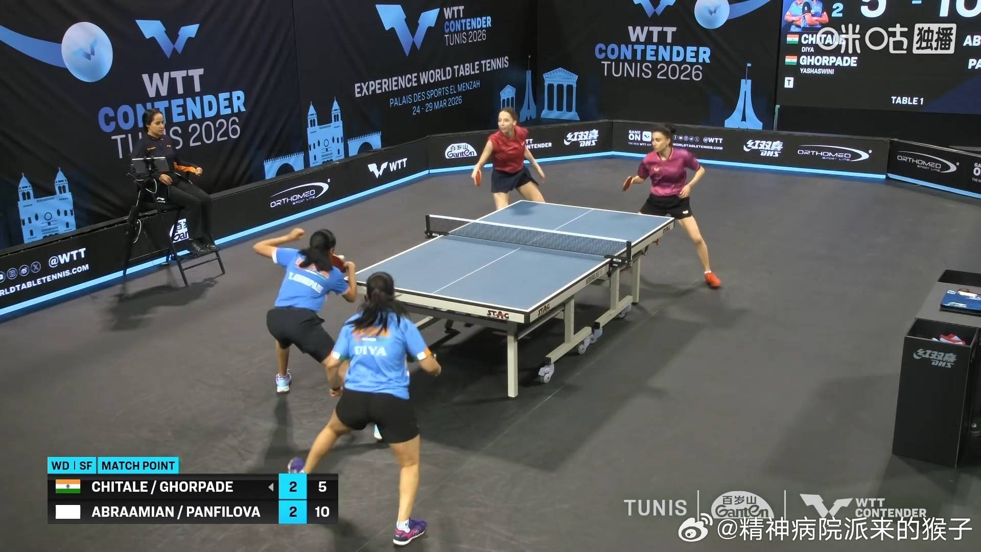 竹谷美凉兼吉优花3比0辛德瑞拉苏提尔塔(7,7,8)亚伯拉罕潘菲洛娃3比2奇塔莱戈尔帕德(7,10,-10,-11,5)晋级2026WTT突尼斯常规挑战赛女双决赛决赛:竹谷美凉兼吉优花🇯🇵VS亚伯拉罕潘菲洛娃🇷🇺(AIN)