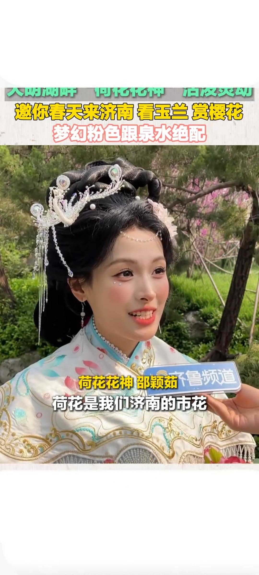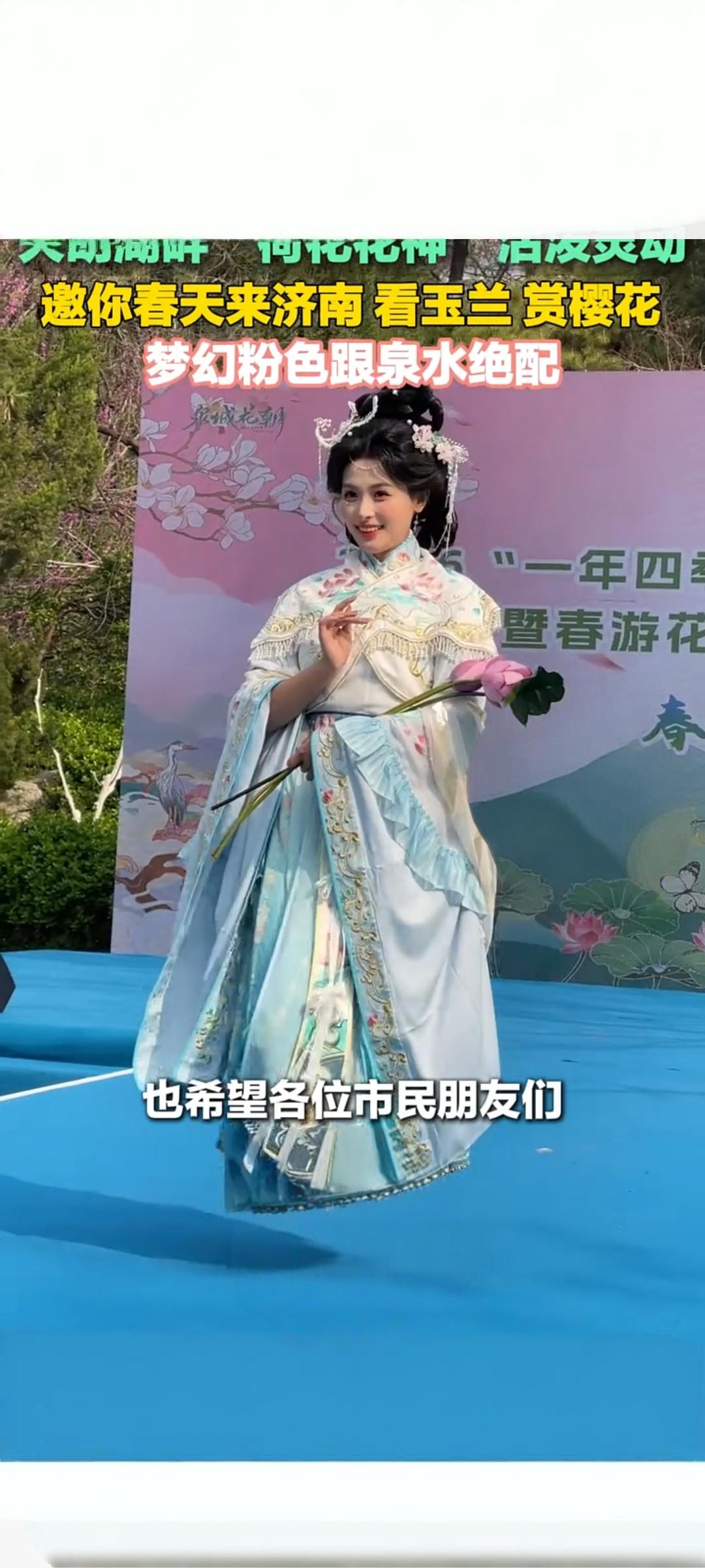 大明湖畔“荷花花神”灵动亮相 邀市民游客共赴济南春日赏花盛宴 近日,济南大明湖畔春意盎然,身着传统服饰的荷花花神惊艳亮相,以活泼灵动的姿态,向广大市民与游客发出春日邀约,共赏玉兰、樱花,邂逅泉水与繁花相映的浪漫景致 。相关短视频在快手平台一经发布便收获关注,播放量达4782次,引发众多网友对泉城春日的向往。 作为济南市花,荷花象征清雅高洁。本次亮相的荷花花神造型雅致,与大明湖的湖光山色完美相融,成为春日里一道亮眼风景线。眼下正值泉城赏花佳期,大明湖沿岸玉兰素雅绽放、樱花粉嫩如云,梦幻粉色花海与澄澈泉水相互映衬,勾勒出“半城湖色半城花”的唯美画卷,尽显“四面荷花三面柳,一城山色半城湖”的独特韵味 。 此次花神亮相,也为济南春季文旅活动增添活力。当地依托泉水与花卉资源,打造特色春日文旅场景,吸引市民游客踏青打卡、沉浸式感受泉城之美。不少市民表示,花神与繁花、泉水同框,既展现传统文化之美,又让济南的春天更具诗意与吸引力。济南大明湖荷花花神灵动亮相 诚邀全国游客到泉城春日赏花 随着气温回暖,济南春季赏花游持续升温。荷花花神也热情邀请各地游客,在明媚春光里走进济南,漫步大明湖畔,赏繁花、听泉声、品古韵,尽享独一无二的泉城春日浪漫 。