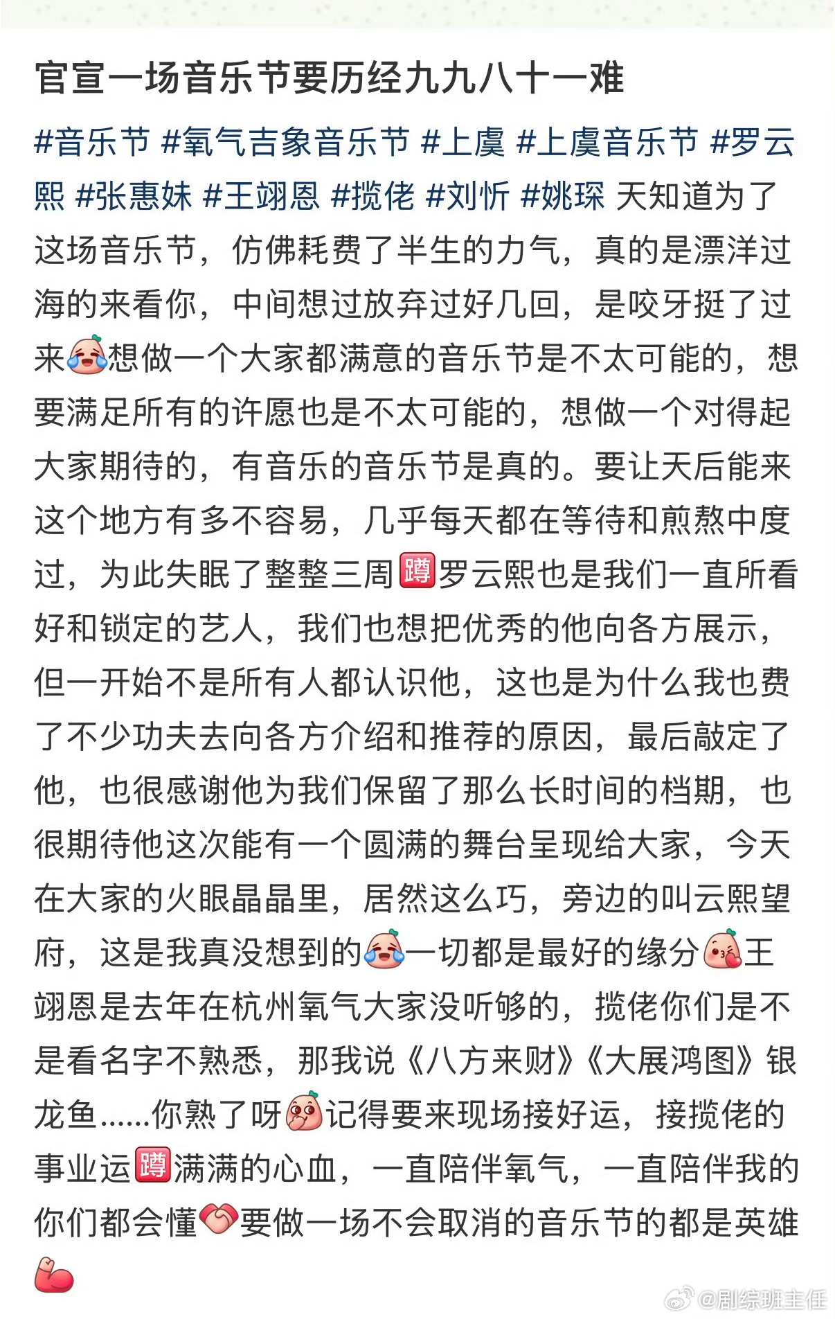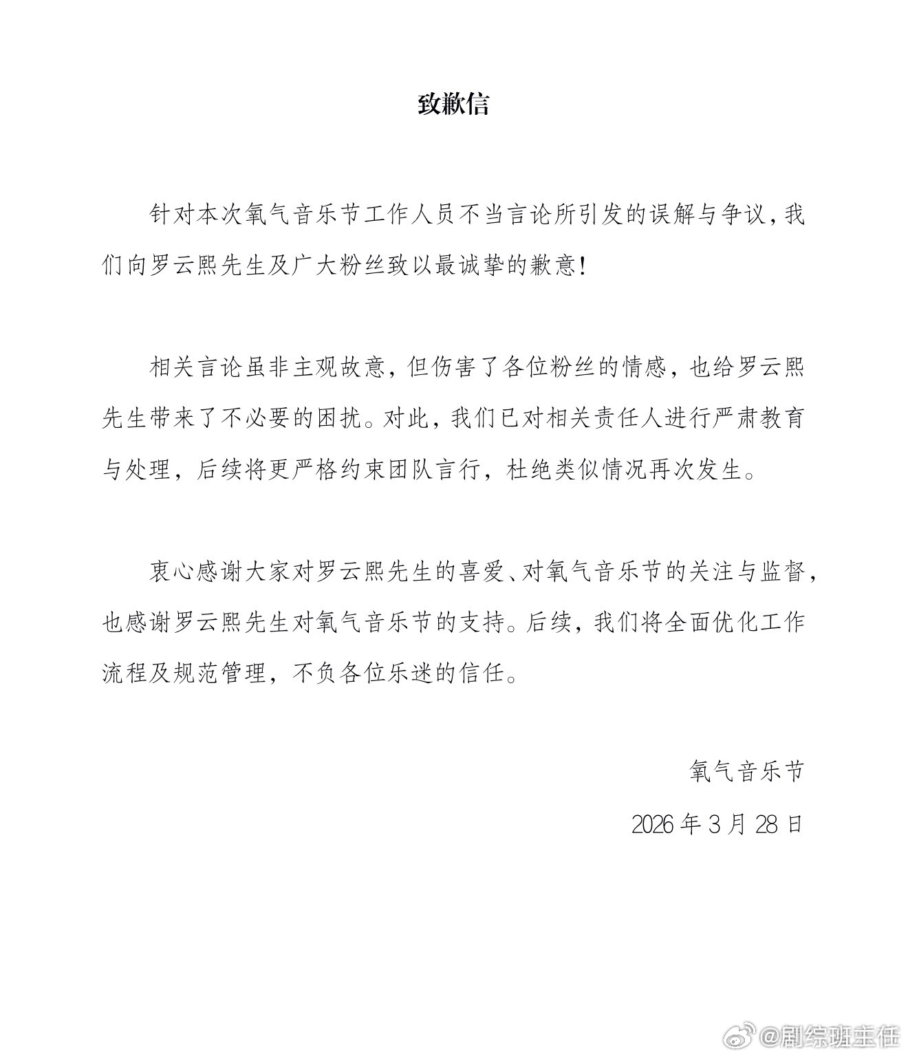 氧气音乐节道歉氧气音乐节因工作人员的不当言论向罗云熙及粉丝道歉了