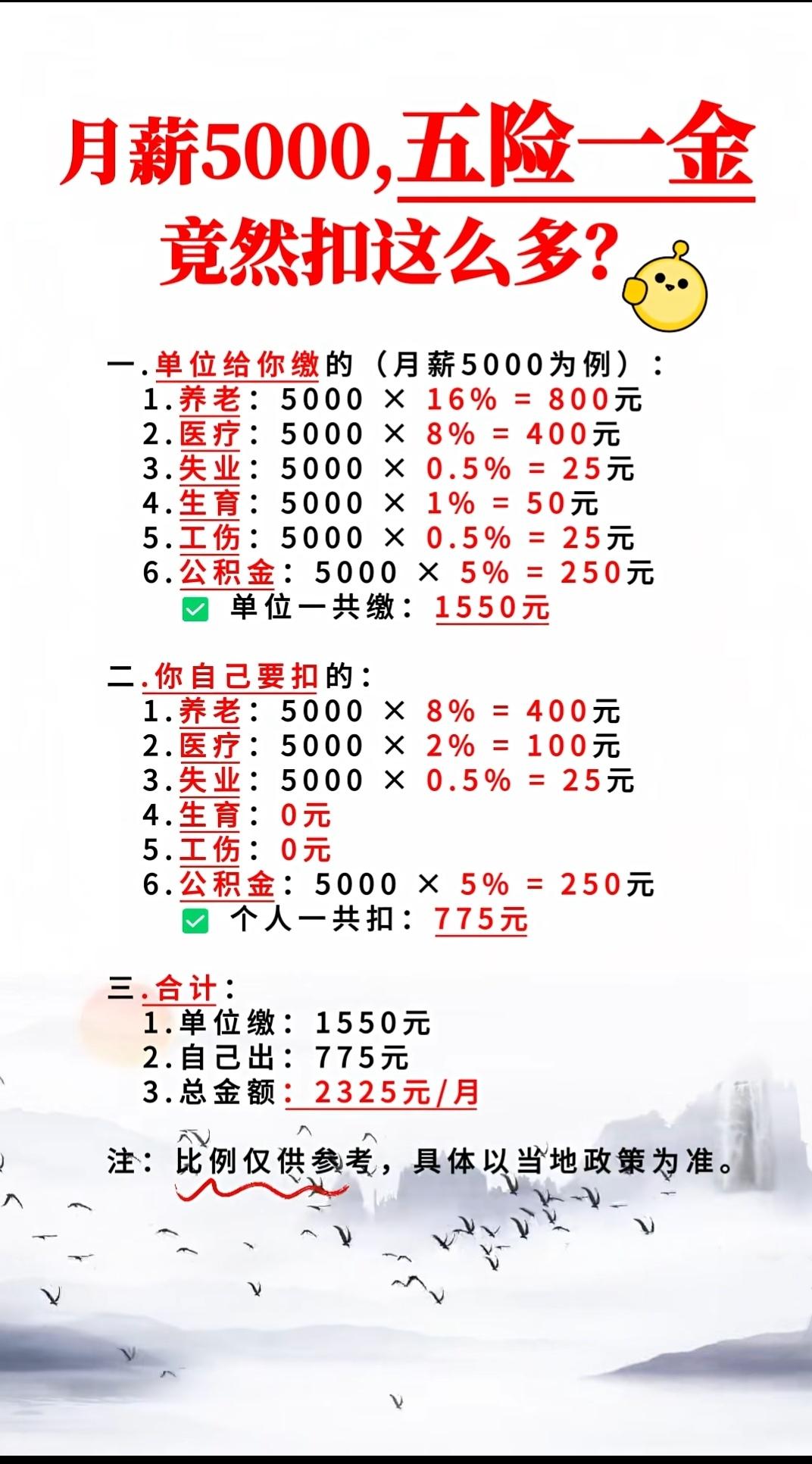月薪5000,五险一金到底扣多少钱? 很多人找工作都要求着“五险一金”,但又不知道“五险一金”具体扣多少钱,就拿月薪5000来说,你和公司加起来,每月在五险一金上要花2325块。你自己要扣775块,公司还要额外掏1550块,这些钱虽然没发到你手里,但都是给你存的“隐形福利”。 这笔钱里有养老、医疗、失业和公积金,以后养老、看病、买房都能用的上,除了这些,还包含生育和工伤的保障。 五险一金其实就是帮你提前攒保障,别觉得到手少了亏,其实公司比你掏得还多。