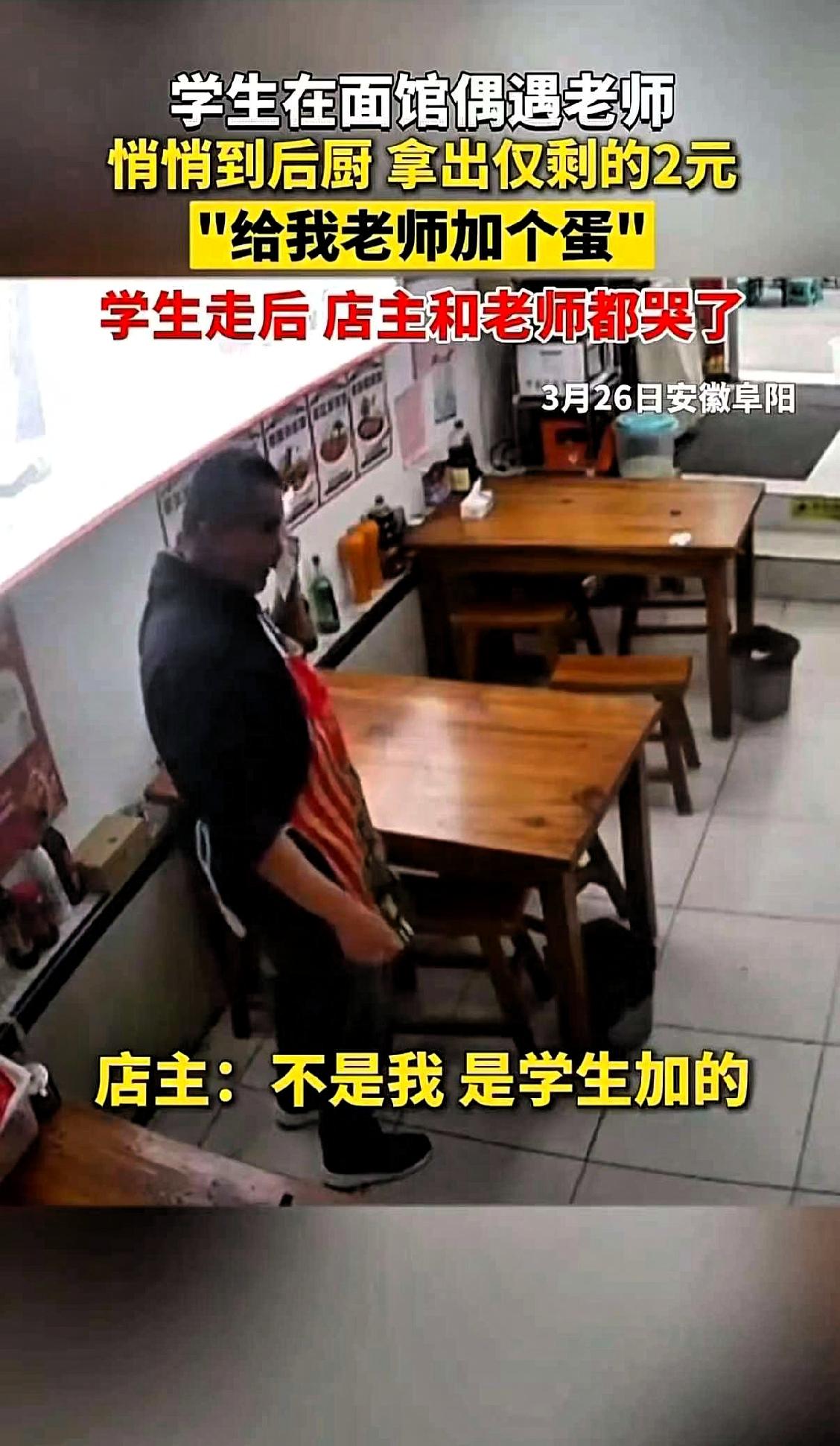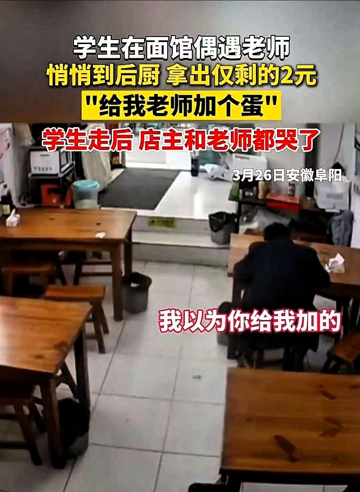 近日,安徽阜阳的两个学生上热搜,原因是两个学生在一家面馆偶遇老师,身上只有两块钱,还是悄悄拜托老板给老师的面里加了一个鸡蛋,老师一开始以为是店家赠送,了解实情后当场感动落泪,一旁的面馆老板也深受触动,跟着红了眼眶。 这件事之所以让人感慨,并不是因为鸡蛋本身,而是孩子身上那份难得的纯粹。我们常常教育孩子要懂得感恩、尊敬师长,可在成年人的生活里,真诚与善意常常被现实与利弊冲淡。很多时候我们不是没有能力付出,而是习惯了计较值不值得,有没有意义,慢慢少了义无反顾的真心。 两个孩子用自己仅有的钱,表达对老师的心意,不多,却已是全部。这件小事也让我们看清,真正的关怀从来不是以数量衡量,而在于心意是否真诚。物质可以很微薄,但情感可以很厚重。 相比各种刻意营造的感动,这种发自内心、不加修饰的善意,反而更能打动人心。它也在提醒我们,无论生活如何变化,保持一份真诚与善良,永远不会过时。 成年人的世界多了几分现实,却不该丢掉心底的温度。这样朴素又真挚的师生情,值得我们好好珍藏。