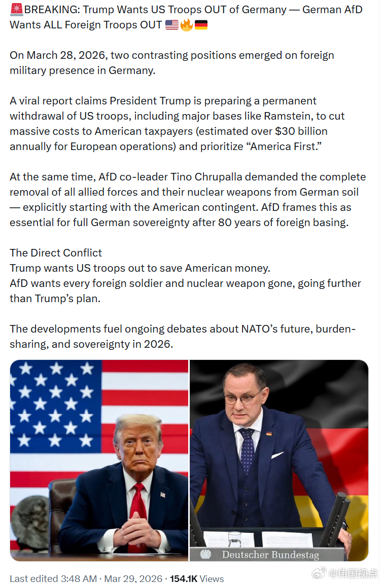 特朗普希望美国军队撤出德国 —— 德国AfD要求所有外国军队全部撤出。2026年