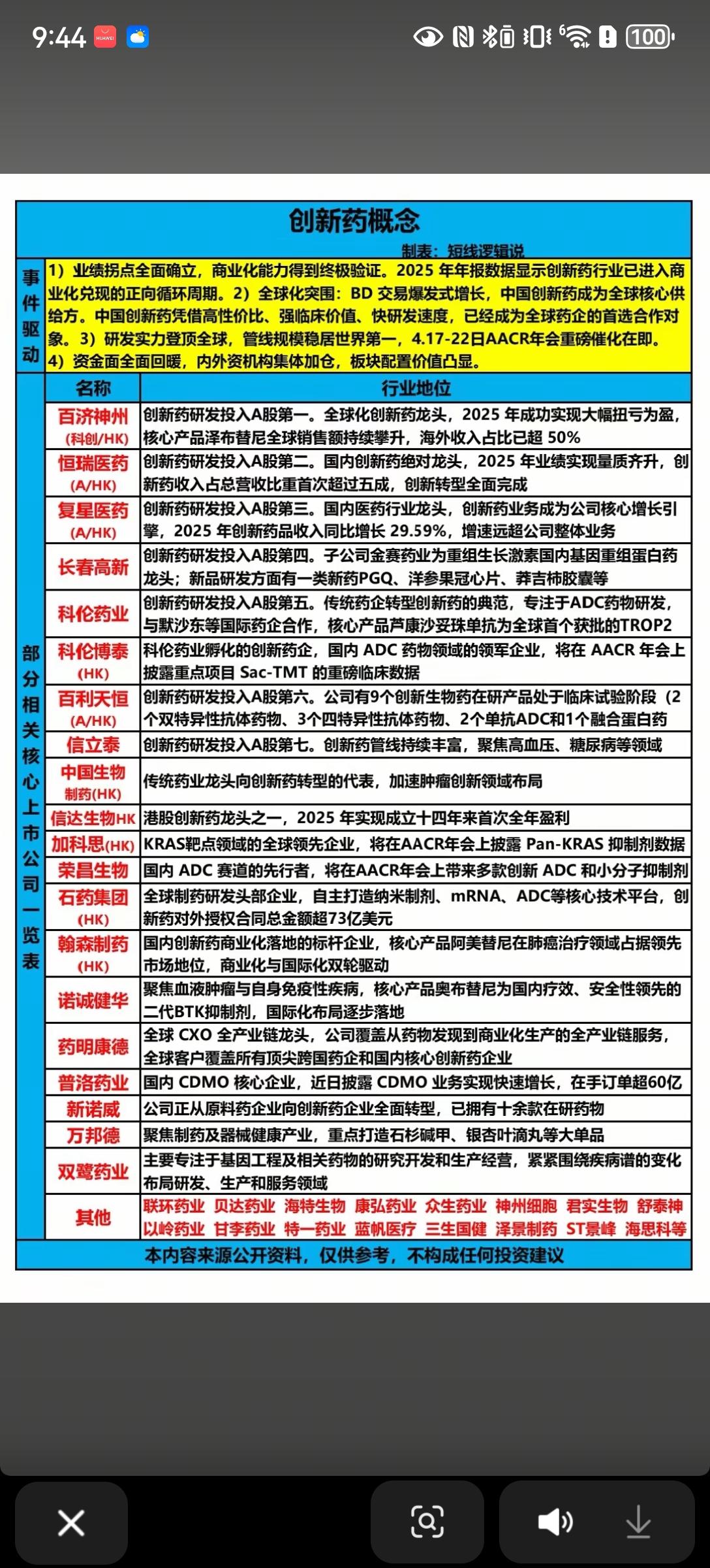 当前行业正迎来多重催化:2025年创新药企业业绩拐点确立,商业化进入正向循环;BD交易爆发,国产创新药加速出海;叠加AACR年会催化、资金面回暖,板块配置价值凸显。 从企业梯队看,百济神州、恒瑞医药、复星医药等为研发投入第一梯队,创新转型成效显著;科伦药业、荣昌生物等在ADC等前沿领域实现突破,药明康德、普洛药业则以CXO/CDMO业务覆盖全产业链。整体来看,创新药行业正从研发驱动转向商业化兑现,国际化与前沿技术布局成为核心看点,后续可重点关注业绩落地与临床数据进展。