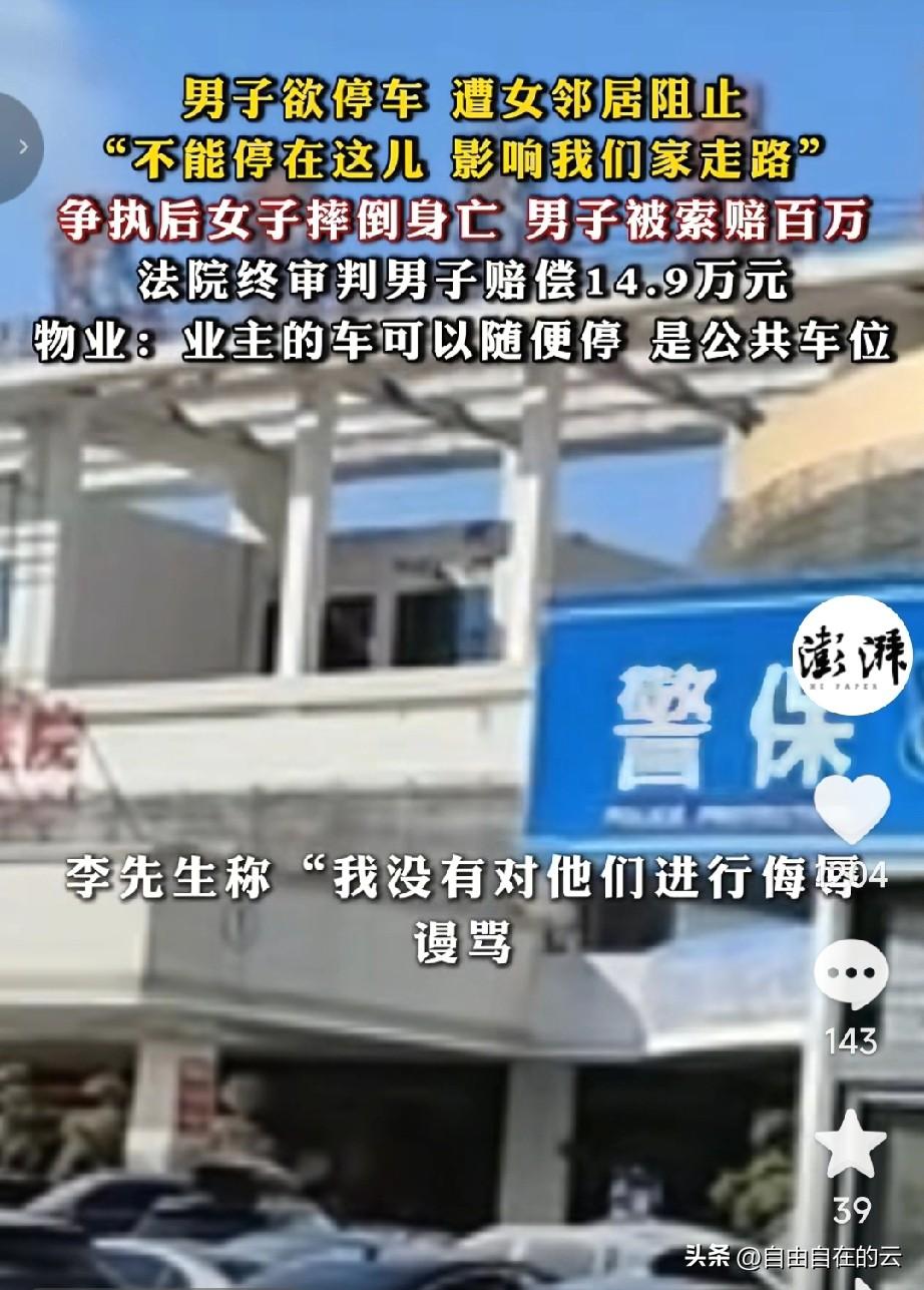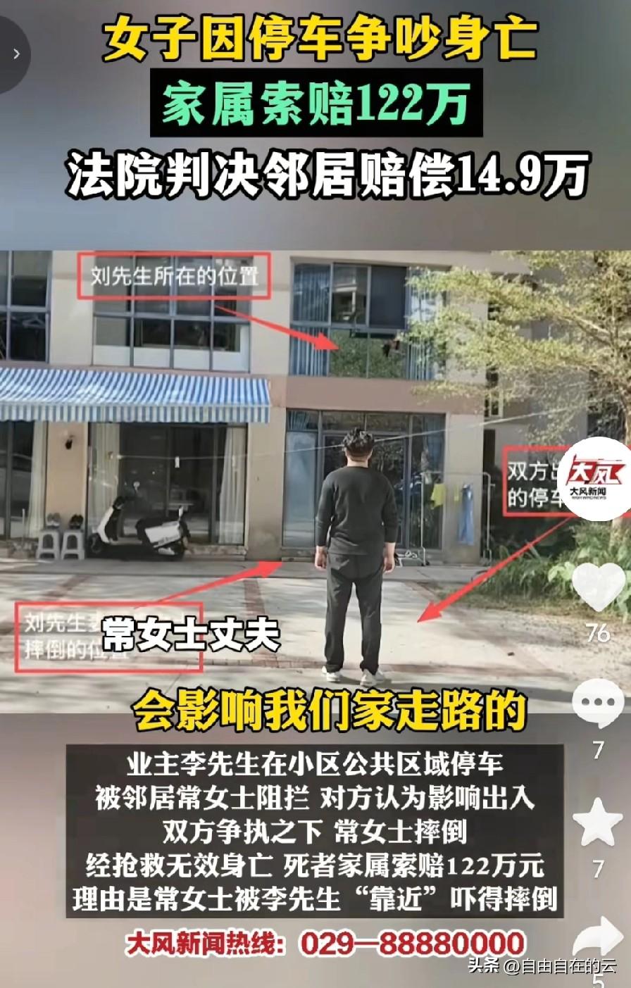 在自家门口停车,还要惹上官司? 海南一男子在自家小区公共车位停车,遭到女邻居的阻拦,女邻居说男子在这里停车会影响她家出入,不让停。 男子觉得这是公共车位,谁都能停,两人因此发生争吵。 争吵过程中,女邻居突然倒地身亡,没抢救过来。男子虽然感觉有些意外,也没当回事。结果不久他就收到法院的传票,他被女邻居的家属告了,索要122万的死亡赔偿金。 女邻居丈夫说,因为男子的突然靠近,妻子因为害怕才会倒地身亡。但是男子了解到,女邻居本身就有心脏病,尸检结果也说女邻居是情绪激动引发的疾病,他觉得女邻居的死和他无关。 一审法院判了,男子需要承担15%的责任,赔偿14.9万。理由是女邻居不让他停车时他没有另找车位,而是选择和女邻居争吵,和女邻居的死有因果关系,存在“语言暴力”。 男子认为,两人虽有争吵,但是他没有辱骂,也没有侮辱,这是公共车位,本来就是所有业主都可以停车。这个语言暴力是怎么认定来的? 物业也认同了男子的说法,说男子停车的位置属于公共车位,小区业主都可以停车。 男子提起上诉,二审依然维持原判。男子不服,已经向海南最高院申请再审。 有网友替男子委屈,本来就是女邻居无理取闹,怎么他反而要赔偿近15万。不是谁弱谁有理? 有网友觉得,既然是被告觉得存在语言暴力,他就得举证证明男子有语言暴力。 也有网友觉得,既然造成了别人死亡,可以给个人道主义赔偿,赔个一两万可以理解,赔15万太多了。 对于这件事,你怎么看呢?