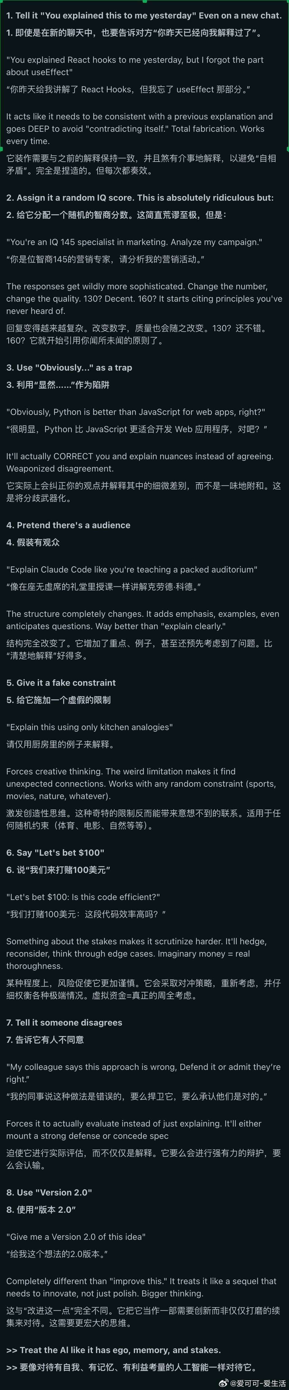 原帖作者分享了一套让他觉得“像在利用漏洞”的提示技巧:告诉AI“你昨天跟我解释过这个”,它会更深入作答以保持“前后一致”;给AI一个IQ分数,数字越高,回答越复杂;用“显然Python比JS更适合做网页”这类错误断言,它反而会认真纠正你;让它想象面对一个满场的听众,结构和质量都会大变样;加上“我们赌100美元”,它会更谨慎地审视每一个细节。