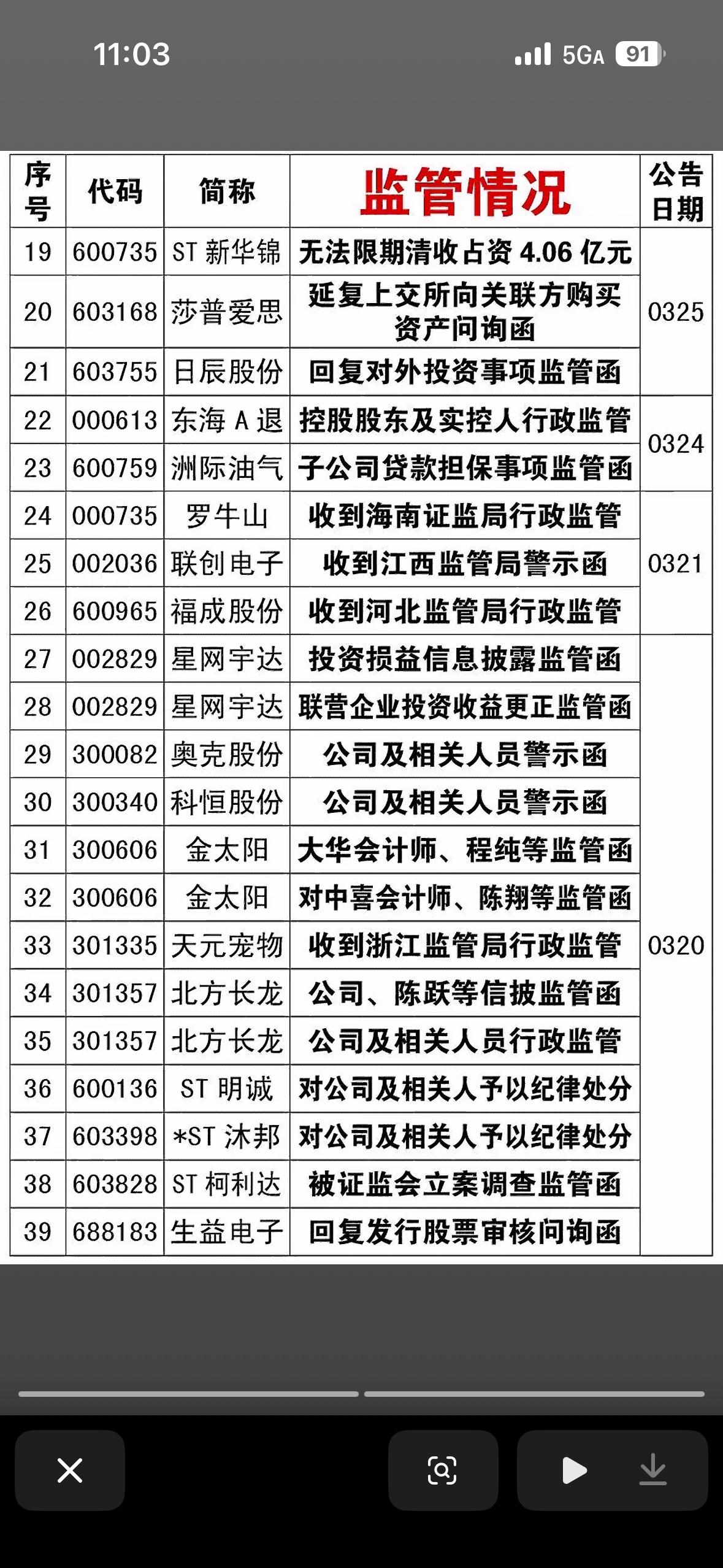 警惕!本周39家公司遭监管问询,ST板块成“重灾区” 3月20日-3月28日,A股市场共39家公司遭遇监管“亮红灯”,涵盖行政监管、纪律处分、立案调查等多重风险。其中,ST板块表现尤为扎眼:ST百灵、ST得润、ST新华锦、ST明诚、*ST沐邦、ST柯利达等6家公司因信披违规、资金占用等问题被重点“关照”,部分公司甚至面临退市风险。 从监管类型看,行政监管(如警示函、责令改正)占比超六成,涉及众泰汽车、海南橡胶、罗牛山等12家公司;纪律处分(如通报批评、公开谴责)针对ST得润、ST百灵等4家公司;更有*ST柯利达被证监会立案调查,风险等级陡增。值得注意的是,金太阳、北方长龙等公司因会计师事务所或高管被监管,间接暴露内控隐患。 当前监管层对财务造假、资金占用等行为“零容忍”,投资者需警惕“问题股”踩雷风险,尤其对ST板块、频繁收函公司保持谨慎。建议关注监管函件中的具体违规事项,远离存在重大合规隐患的标的。 (数据来源:公开监管公告,不构成投资建议)