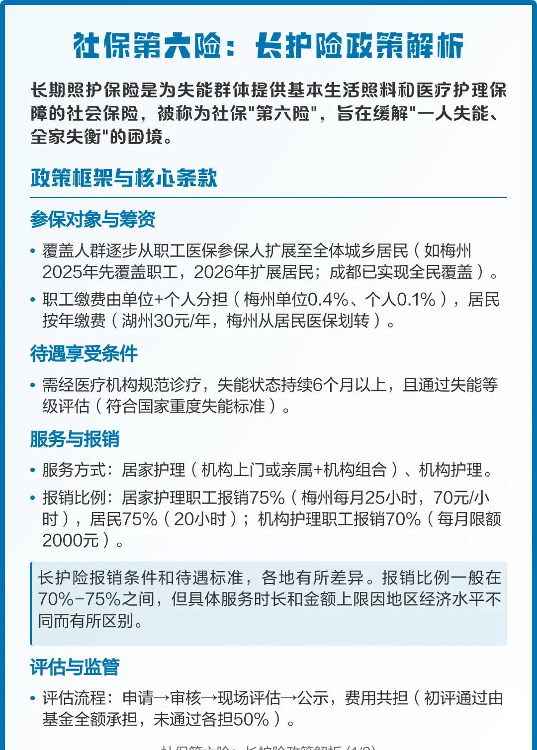 长护险是国家给那些吃饭穿衣都困难的失能老人凑点请护工的钱。别看交得少,关键时候是真顶用! 比如山东大妈失能后每月1600护理费,长护险能报掉1120,自己只掏480,一年省下一万三。杭州重度失能的老人,每月能领1500到2100补贴,八成人都用这钱请人上门帮忙,一小时报60块,实实在在减负担,全国能帮了三百多万老人。 有人说这点钱杯水车薪?确实没法全包! 真要全天候专业护理,一个月得5000往上,长护险报个两千左右顶天了,剩下的还得家里贴。国家也在防有人钻空子骗保,查得挺严。普通人负担每月几块到几十块,换来急需时的大几千报销,对普通家庭绝对是救急钱,值!退休的也要交,想想能报七成,总比全自费强多了。 长护险是雪中送炭的“救急钱”,不是全包大锅饭。它兜不了所有底,尤其重度失能还得靠家底撑,但每月这点小投入,关键时刻能顶大用,对普通家庭绝对是好事儿,有总比没有强!长护险 长期护理保险