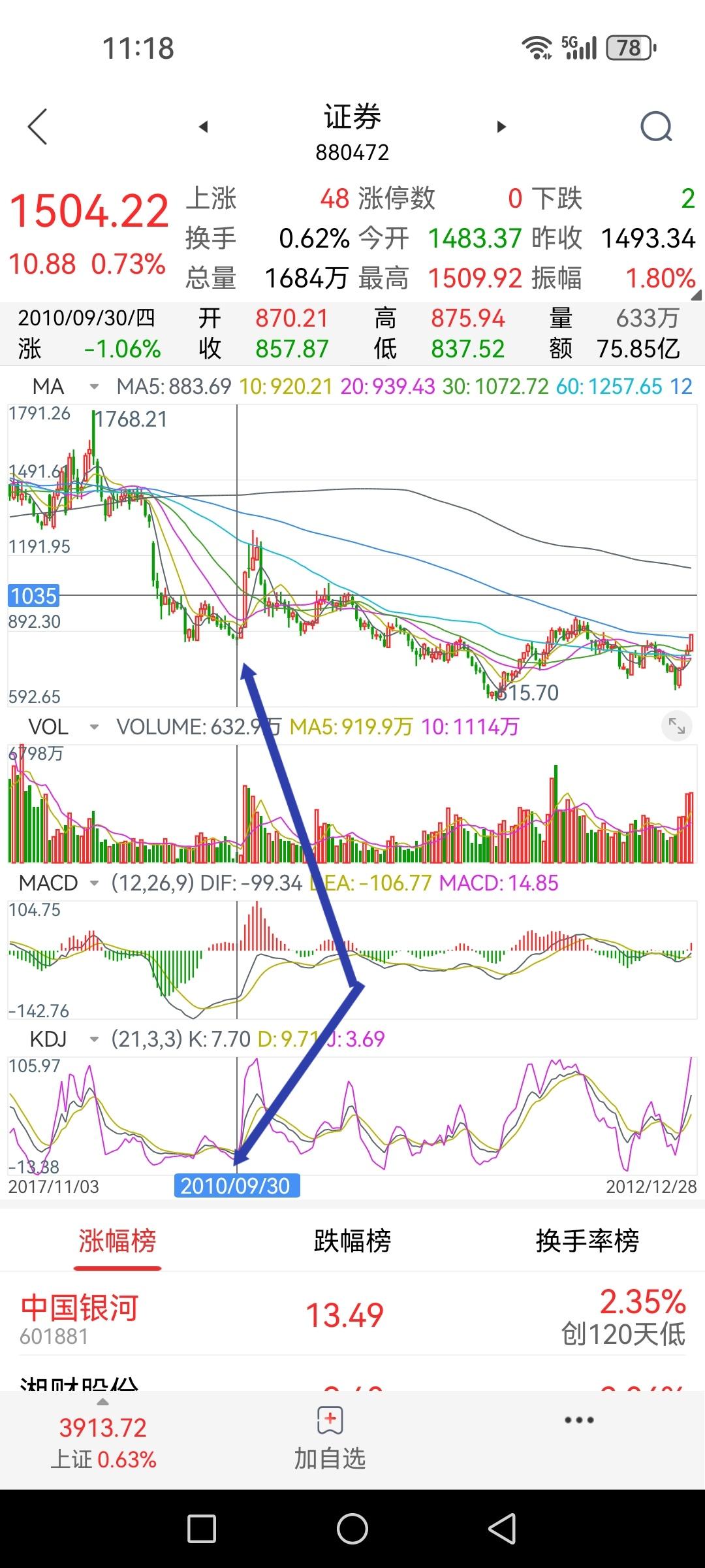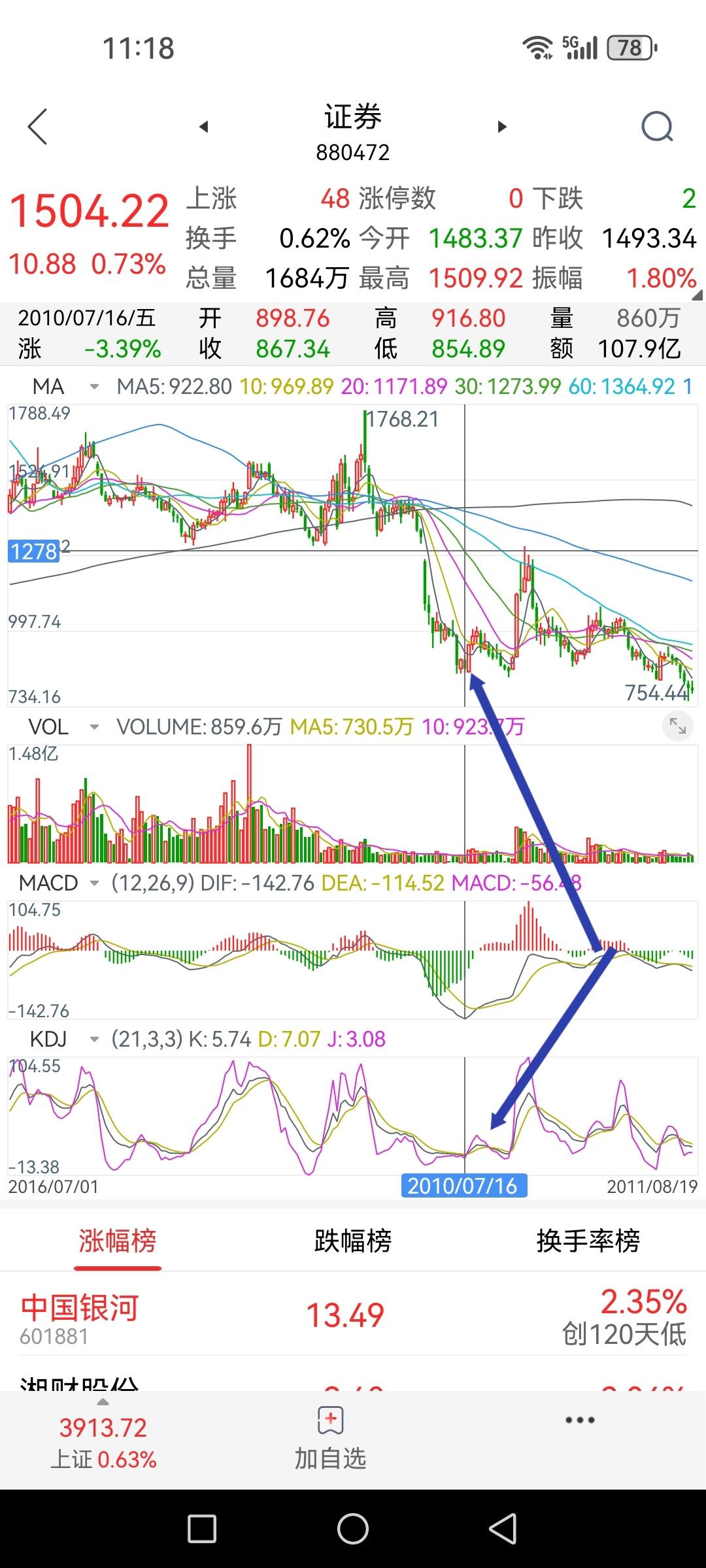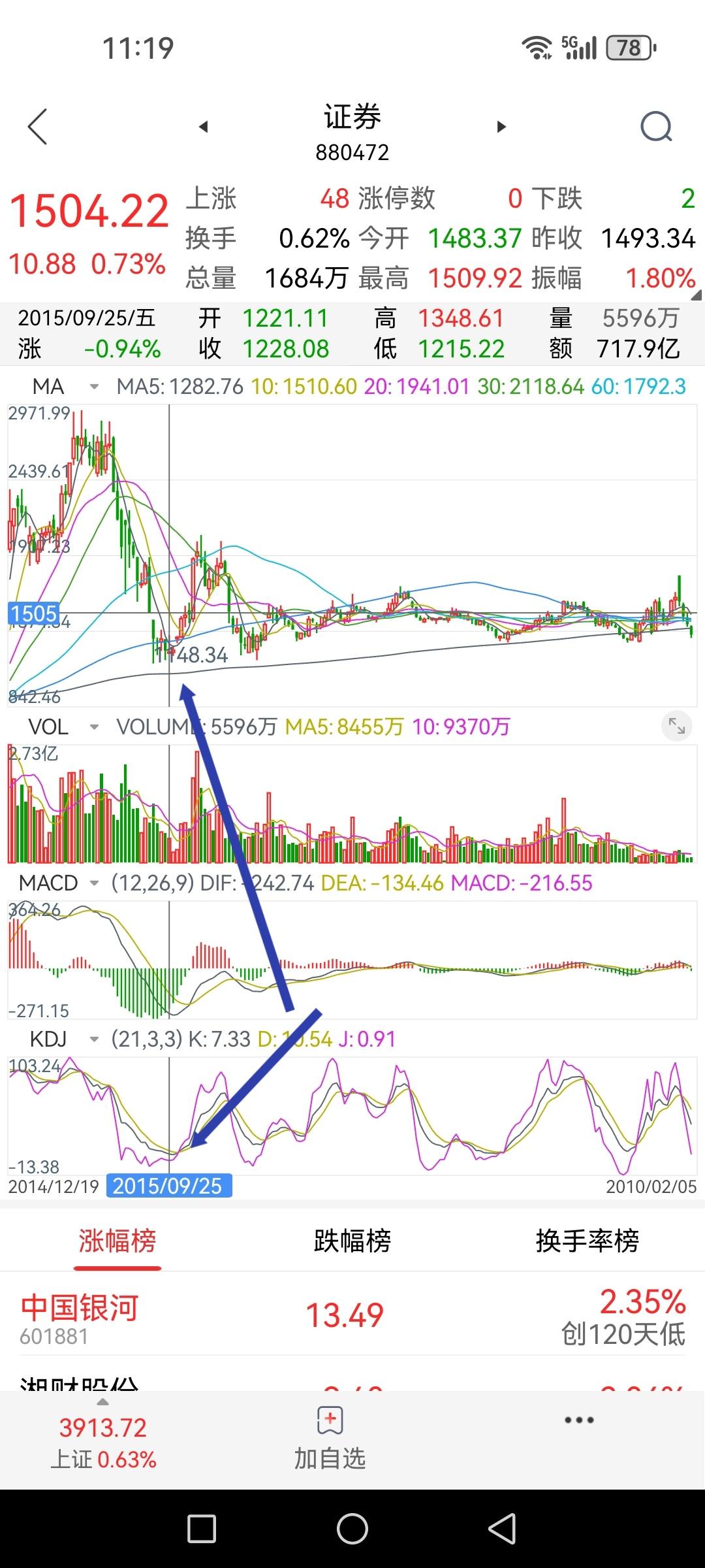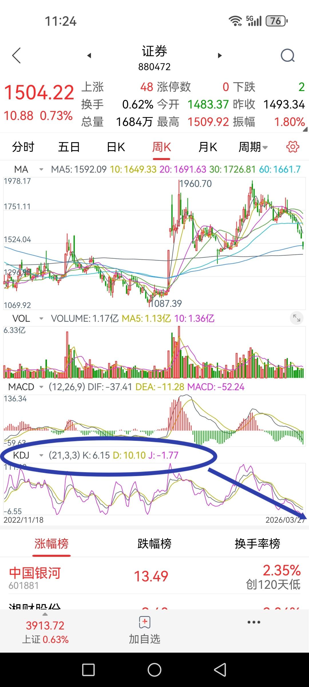 券商板块指数周线KD处于十年来的最低位,K值6.5、D值10.1、J值-1.7。
