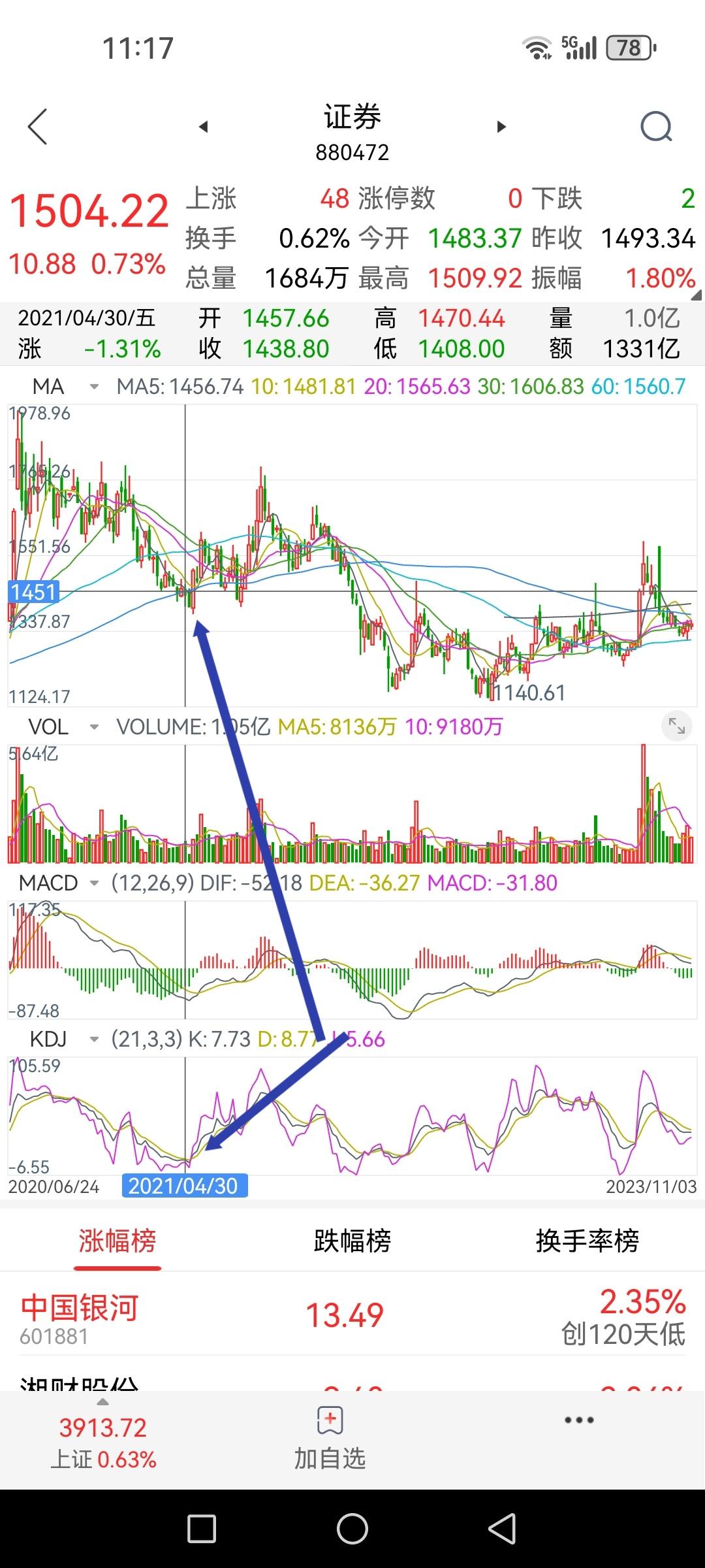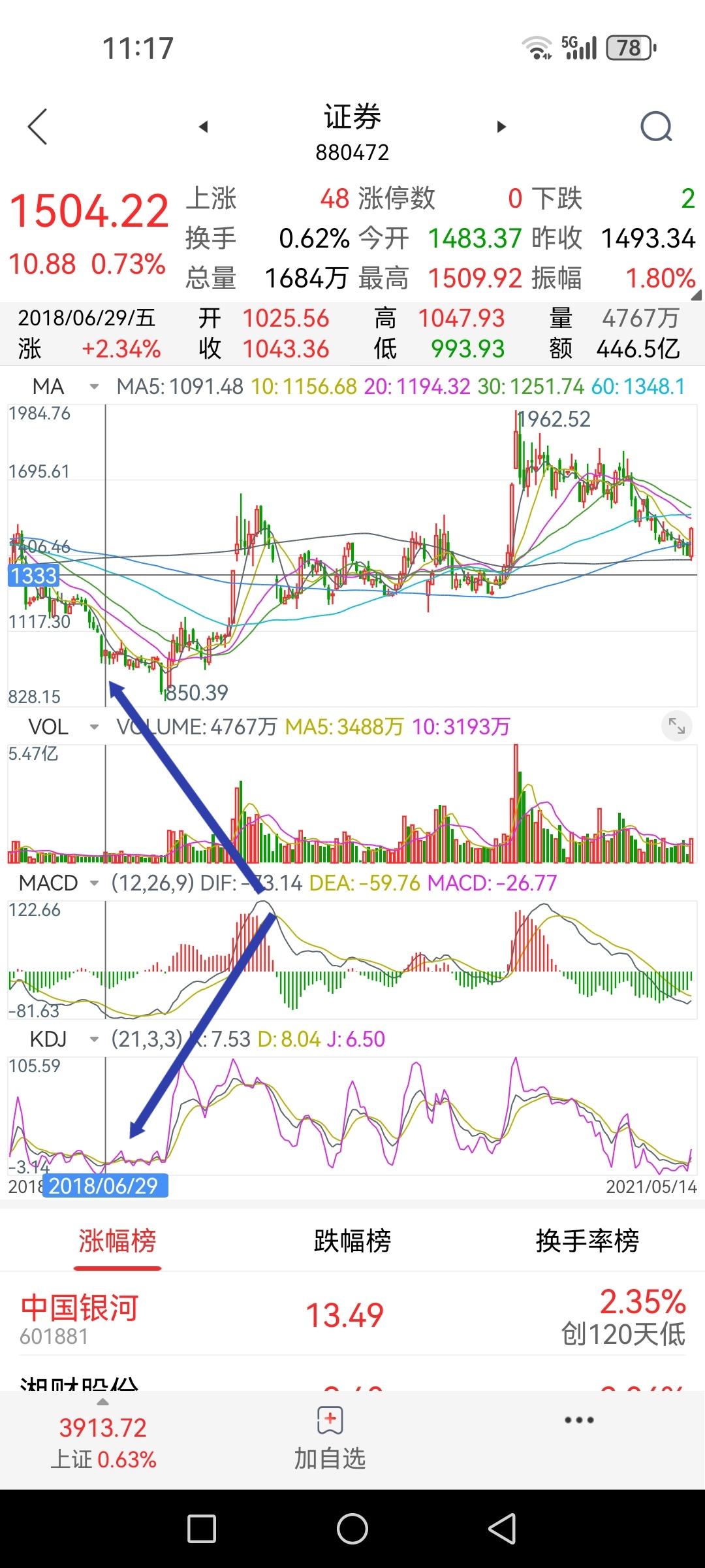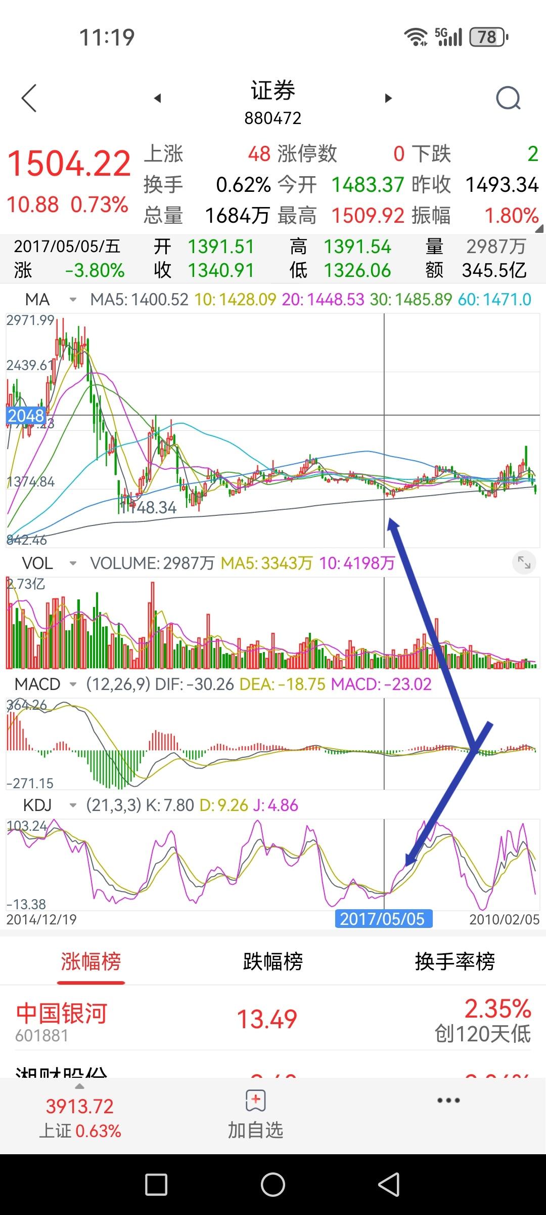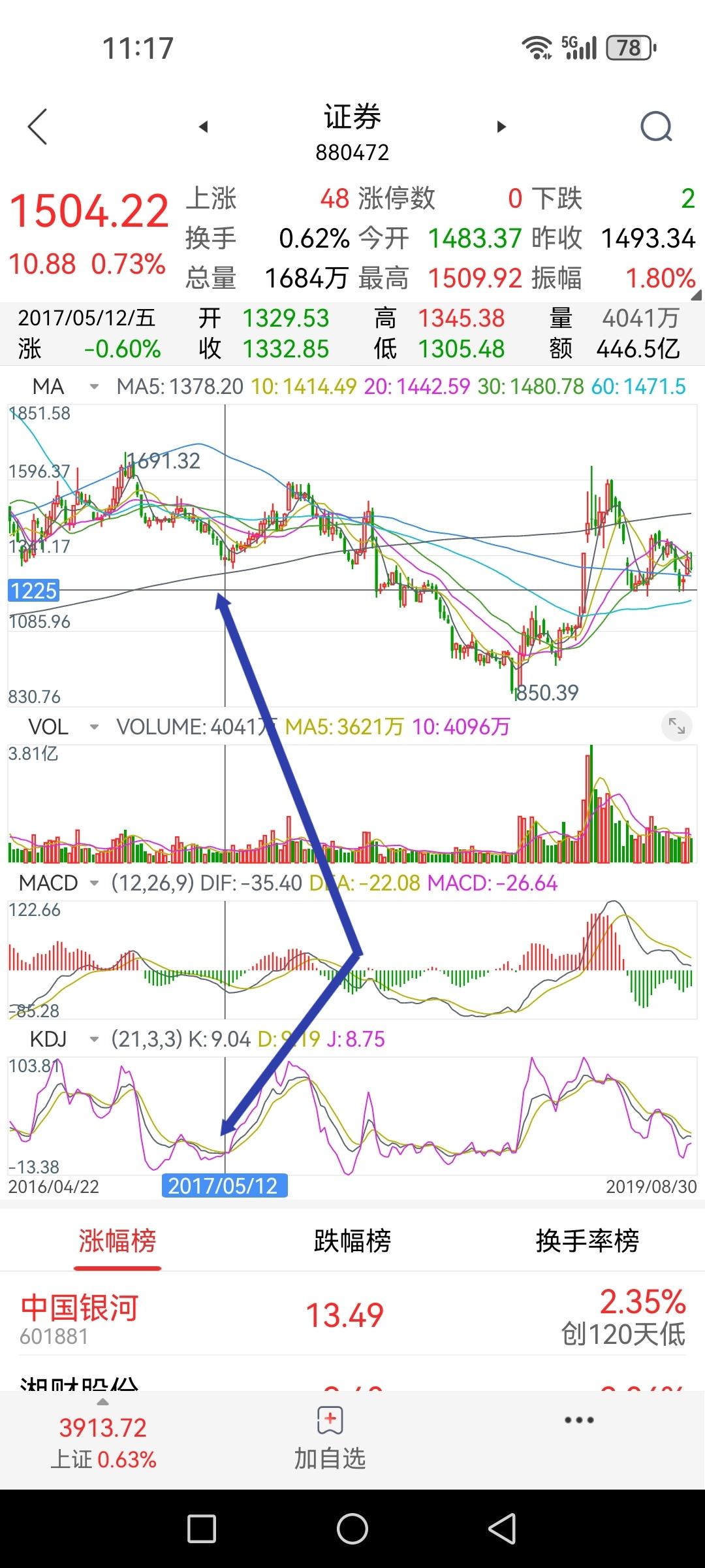 券商板块指数周线KD处于十年来的最低位,K值6.5、D值10.1、J值-1.7。