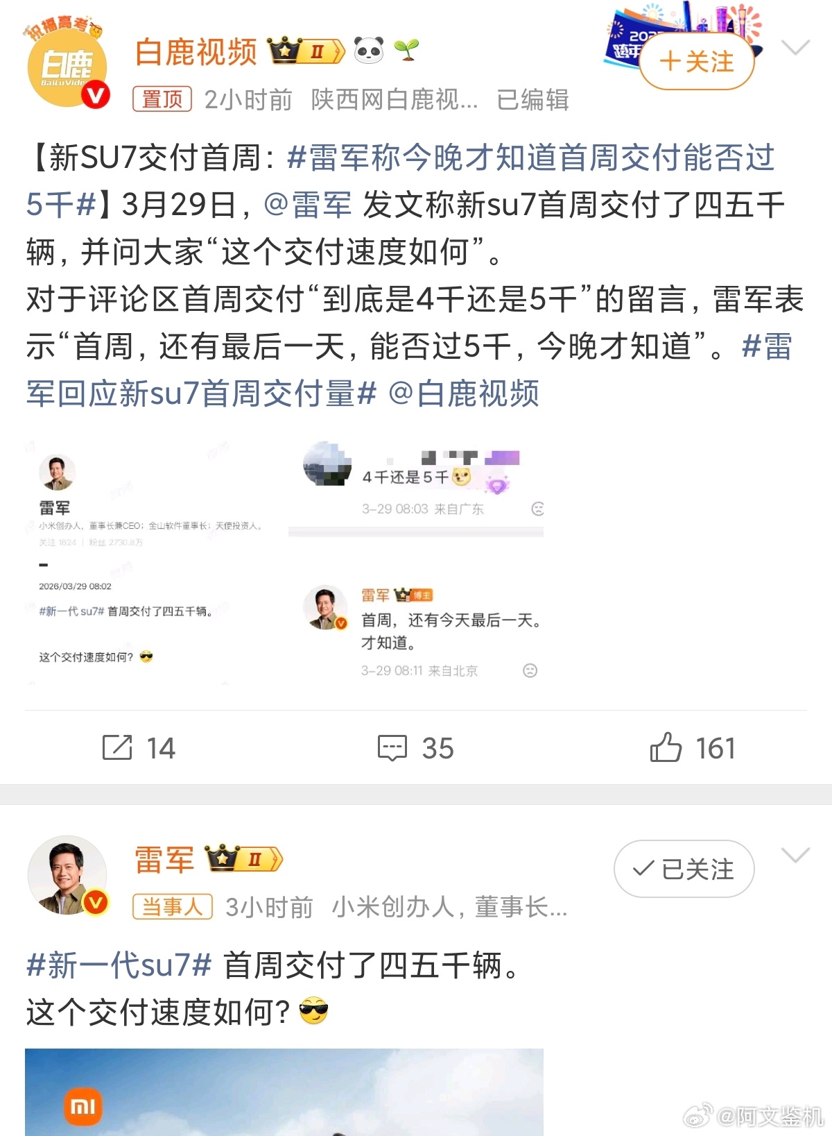 雷军称今晚才知道首周交付能否过5千首周交付五千,太离谱了,这次小米的节奏很快,不像以前下定之后要等很久,而且今年大家消费更理智,也少量黄牛囤单,真实用户很多,所以买新SU7的用户很快就能提车了,轿车里唯一能跟特斯拉掰手腕的就是SU7了,消费者会用行动投票,很期待看看其他同类型新品的订单交付情况。