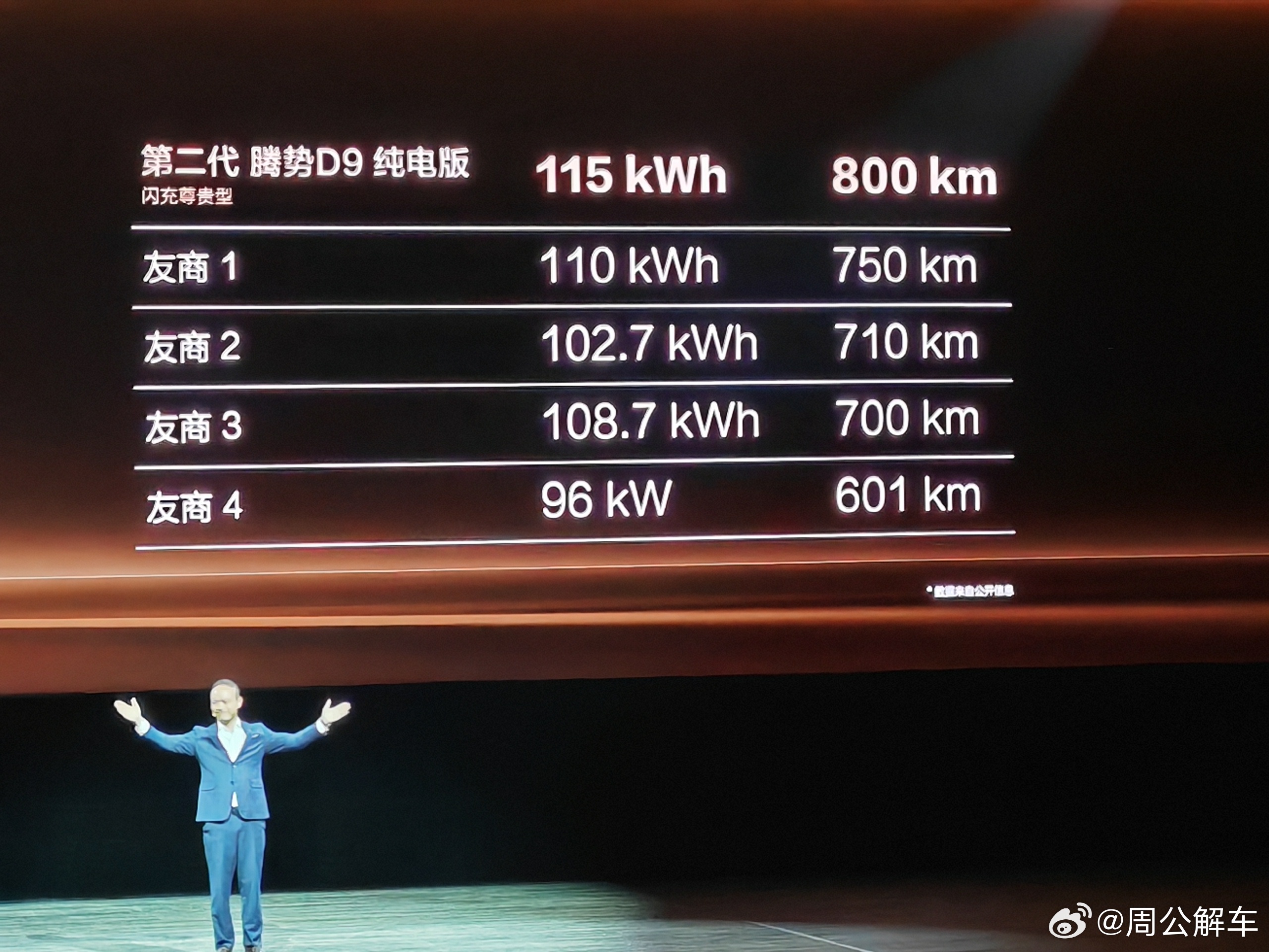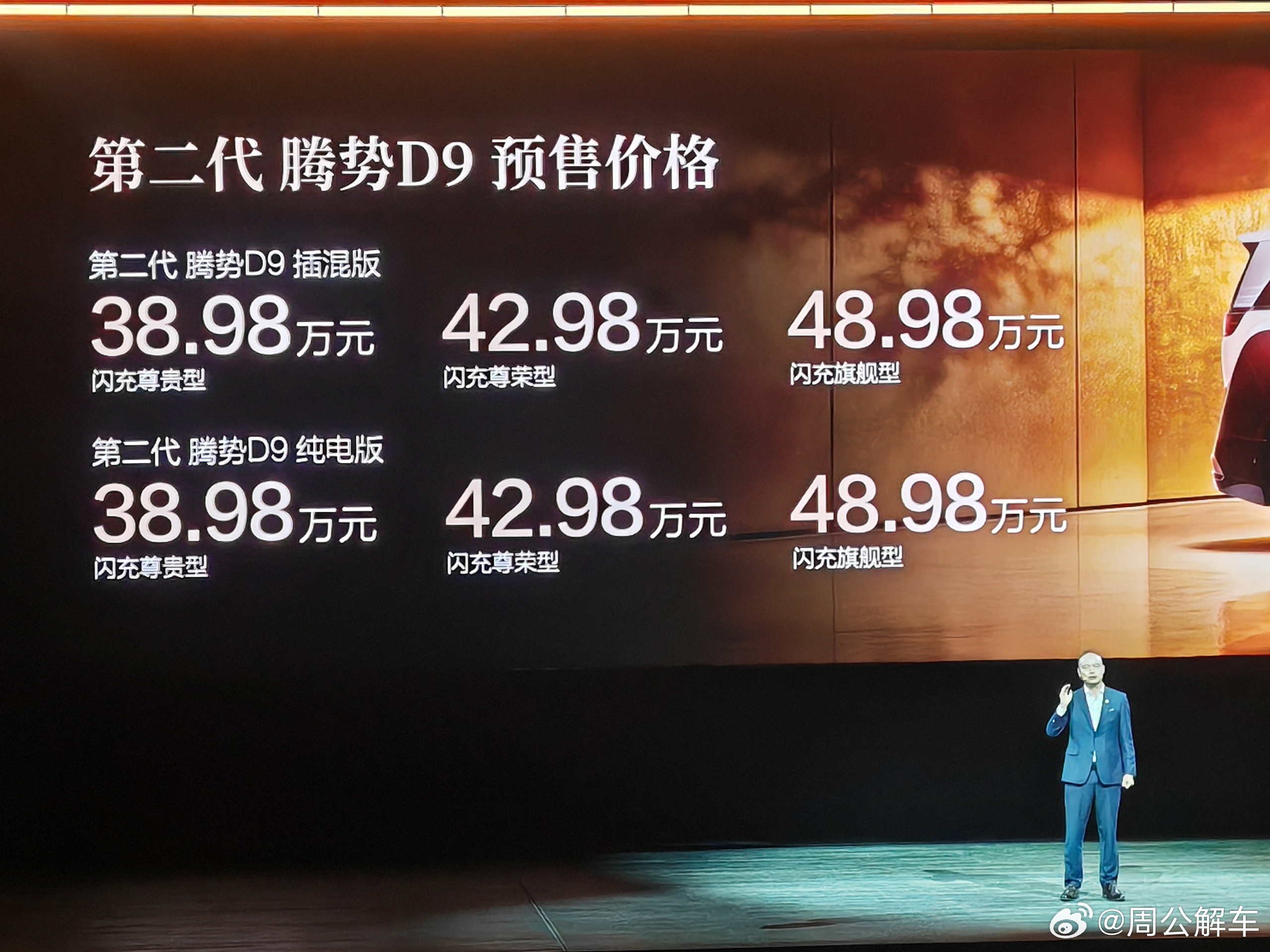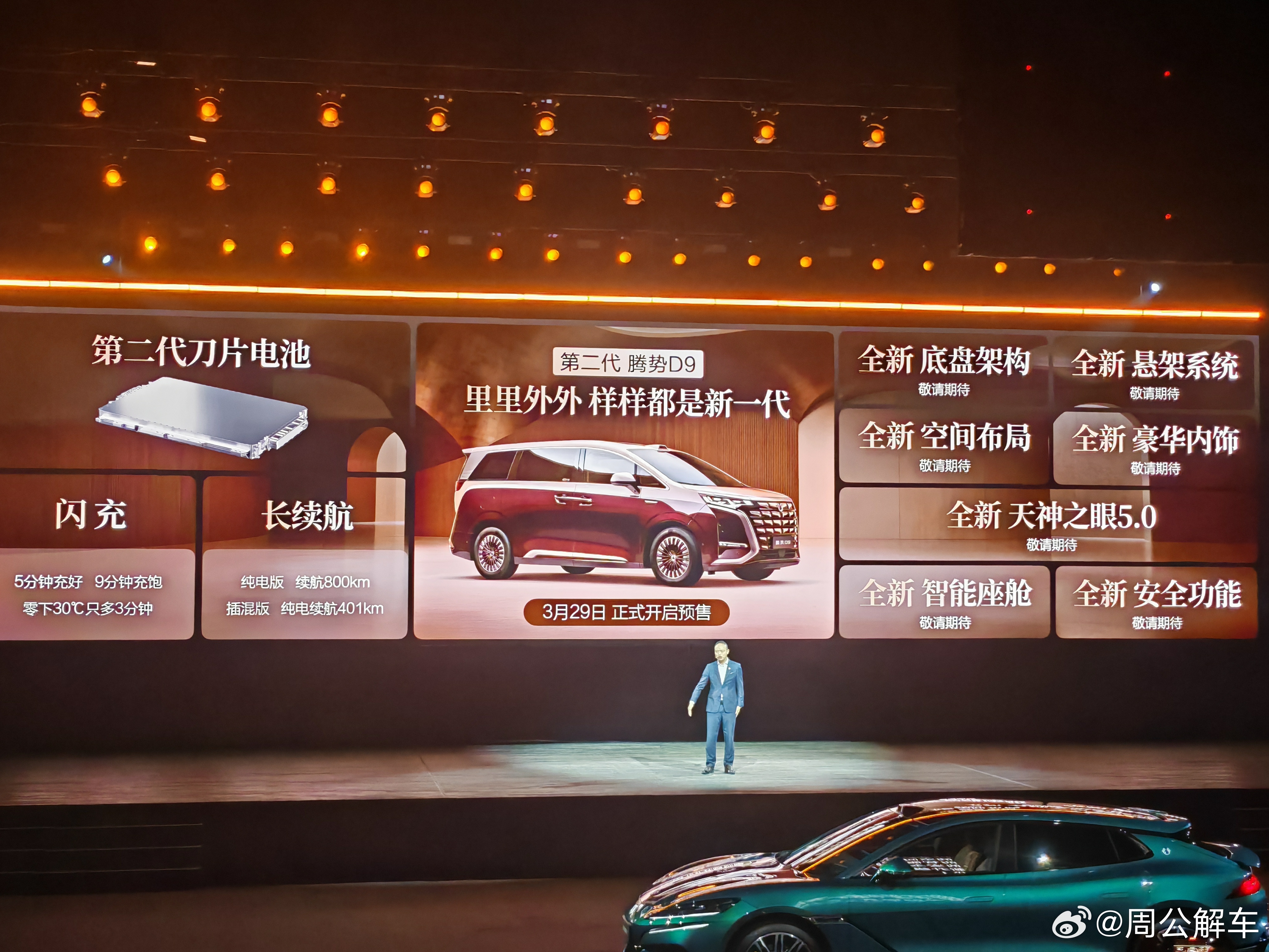 第二代腾势D9、预售价38.98万-48.98万、中国豪华MPV价值新标杆、第二代刀片电池、EV纯电续航800km、插混车型纯电续航401km、5分钟充好9分钟充饱、标配怀挡、全新升级「零压云绒座椅」、全新内饰设计、连续三年蝉联MPV年度销冠、全球首款达成30万辆销量的新能源MPV。第二代腾势d9