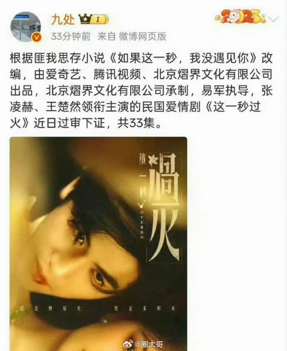 这一年过火过审下证张凌赫、王楚然主演的电视剧《这一秒过火》又有新消息了啊,新剧已经过审下证了,共33集,看来里开播不远了。就是说这部剧的主演全员神仙阵容,坐等张凌赫和王楚然给大家伙撒狗粮啦~张凌赫王楚然这一秒过火共33集
