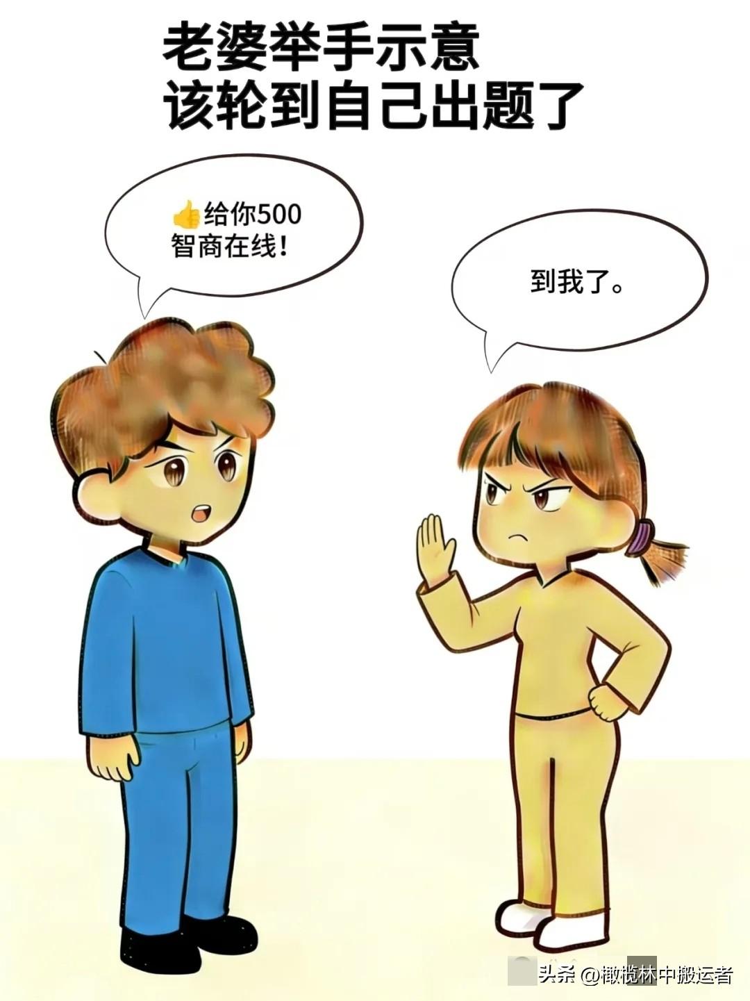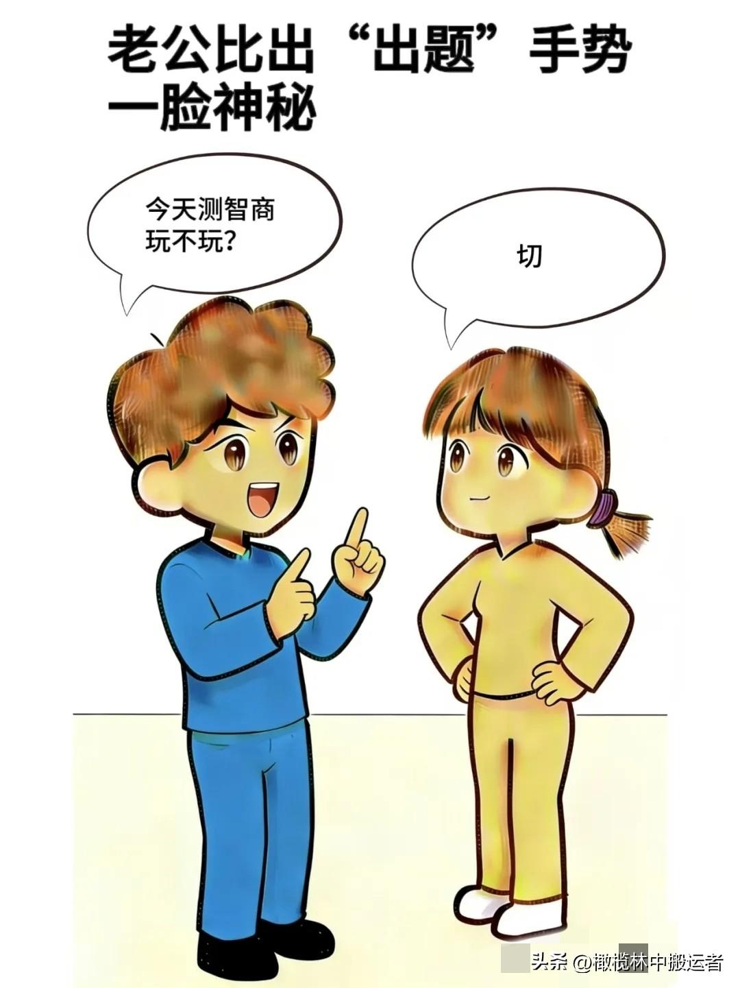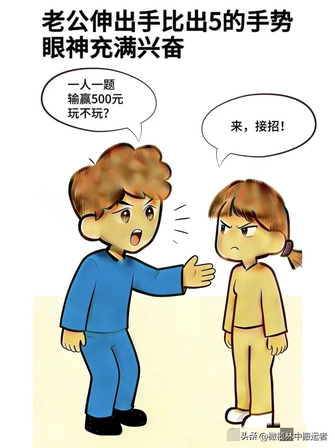 趣味漫画:老公:亲爱的,来不来,老婆:来什么,别让我上火,老公:今天测智商,玩不玩,老公:一人一题,输赢500,老婆:来,接招夫妻日常漫画
