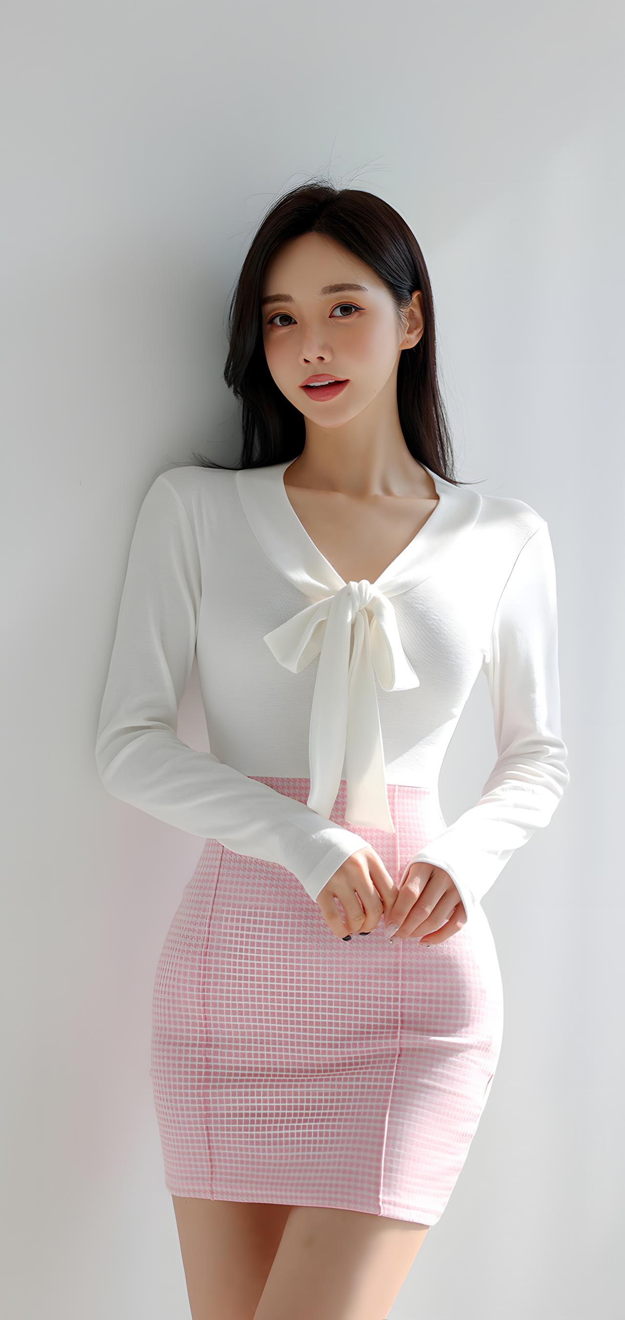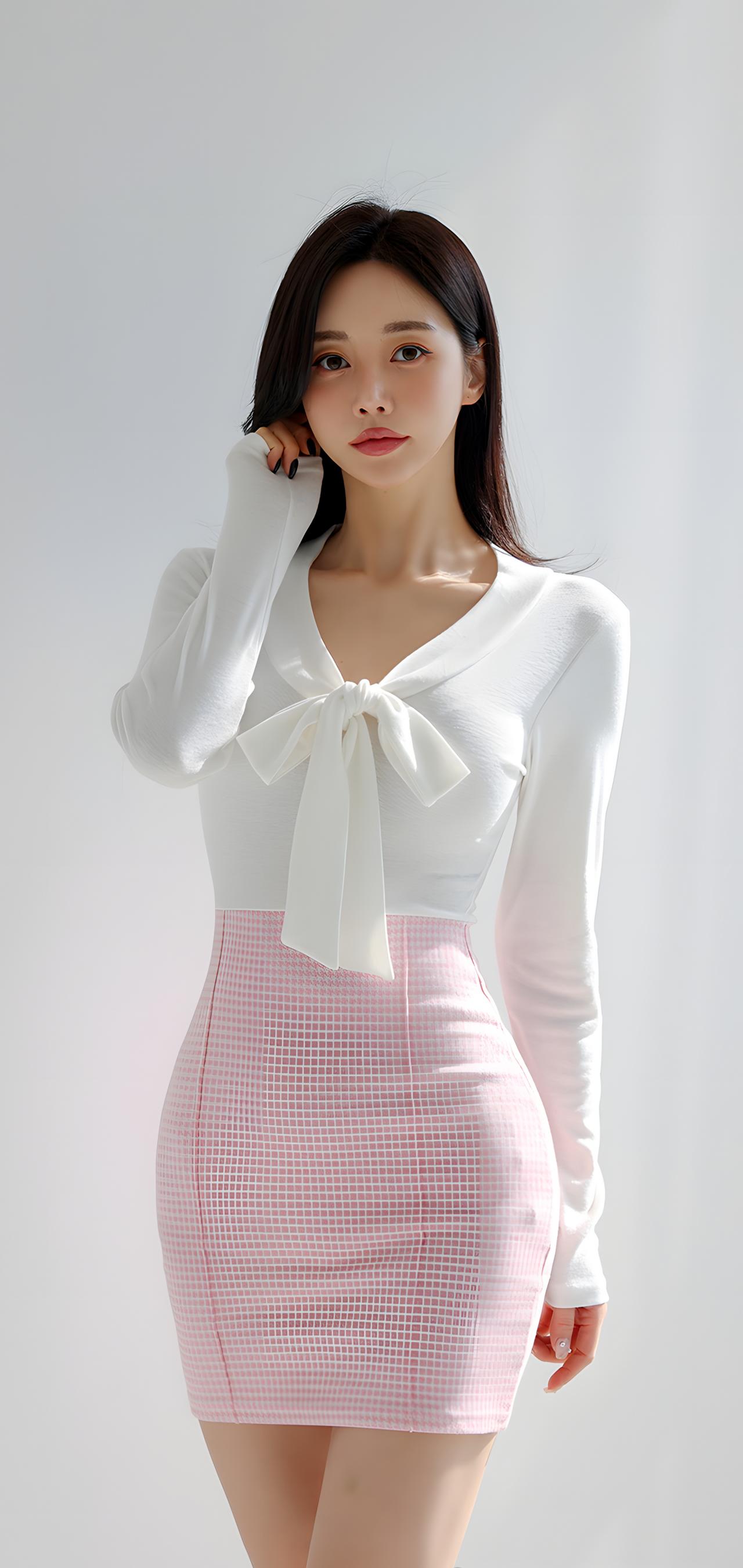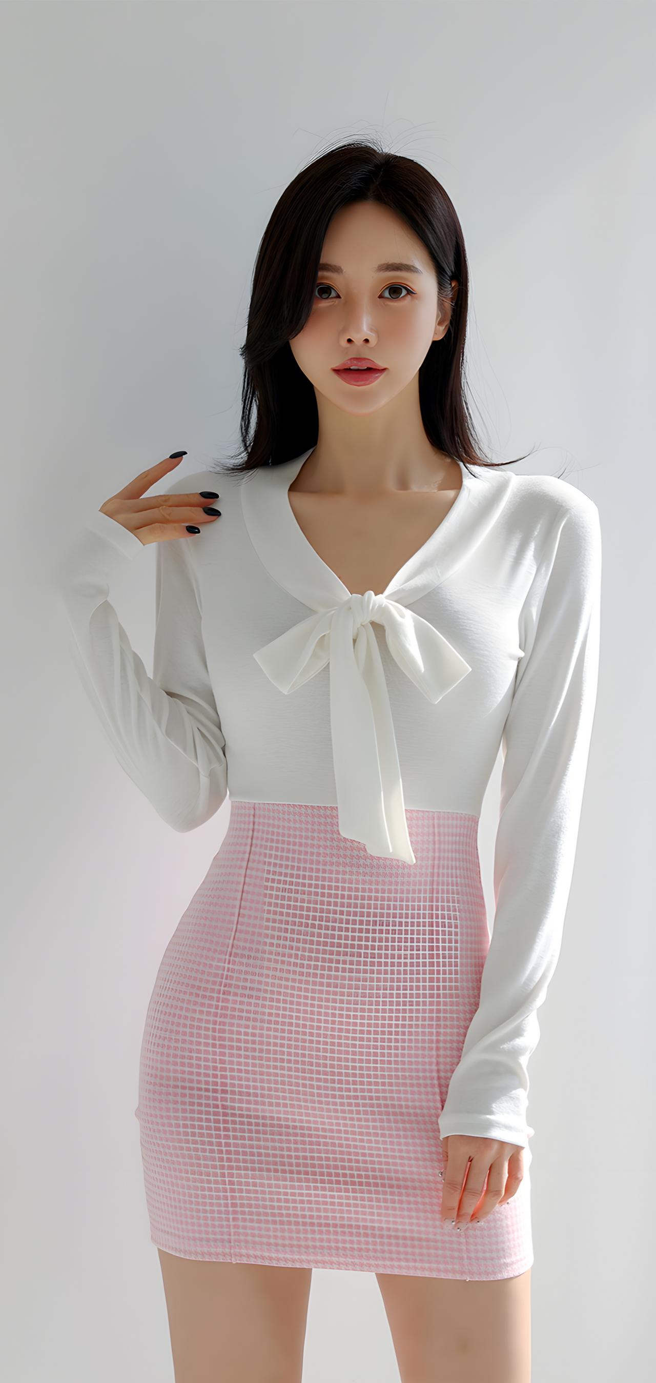 清新甜美穿搭,粉色格纹短裙搭配白色长袖上衣,优雅迷人!