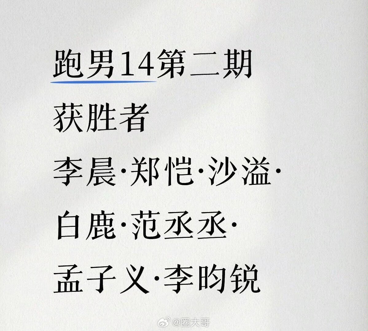 奔跑吧14第二期repo《奔跑吧14》第二期repo来了。获胜者有:李晨、郑恺、沙溢、白鹿、范丞丞和孟子义和李昀锐。昀牵孟绕合体常驻跑男,没想到就拿了冠军,跑男团的颜值和实力,看得出来俊男美女很是用心了~奔跑吧14第二期获胜者