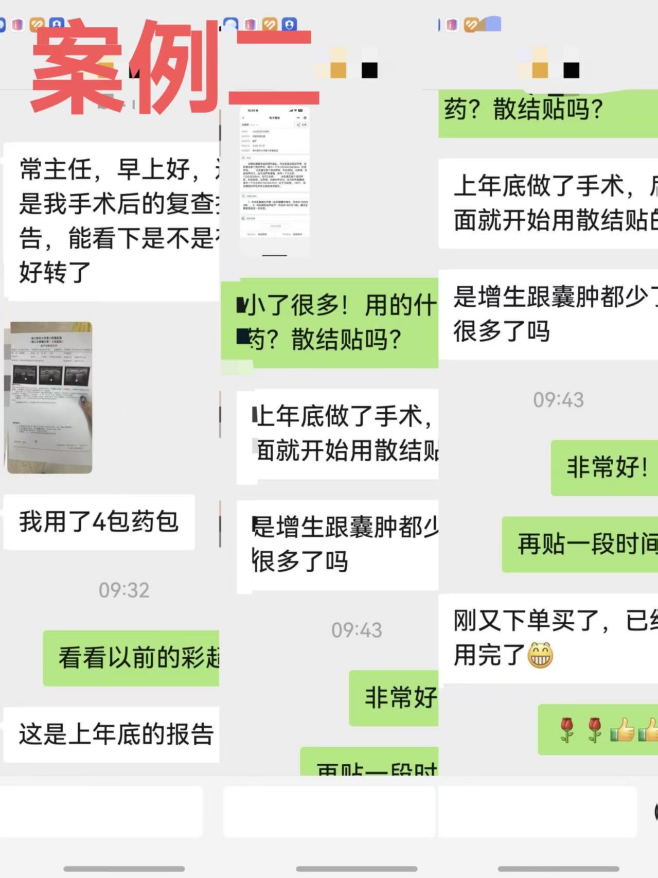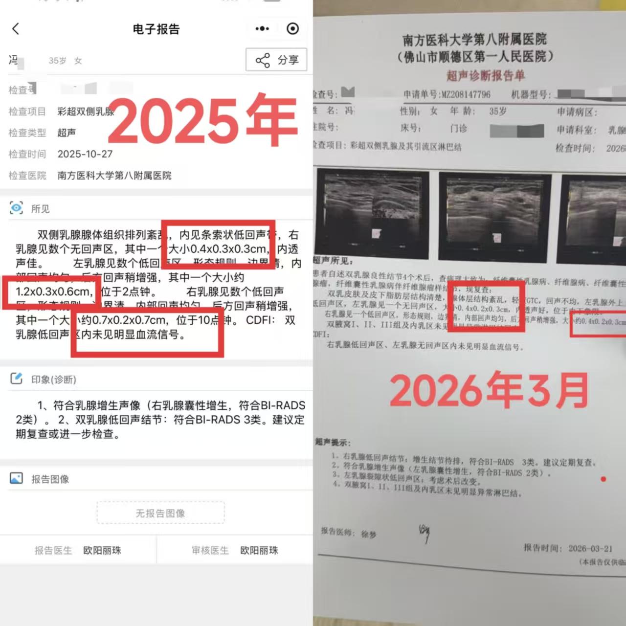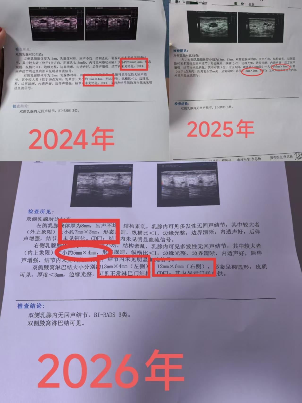 分享两个使用“乳痛散结贴”的案例:一个是乳腺增生合并囊肿,使用一个多月,增生疼痛缓解了,囊肿从20×19㎜缩小到7×3㎜;另一例是手术后复发的,使用一个月左右,左侧实性结节(3类)从12×6㎜缩小到4×2×3㎜,右侧从7×2×7㎜缩小到4×2×3㎜。继续观察中、期待中……[玫瑰][玫瑰]