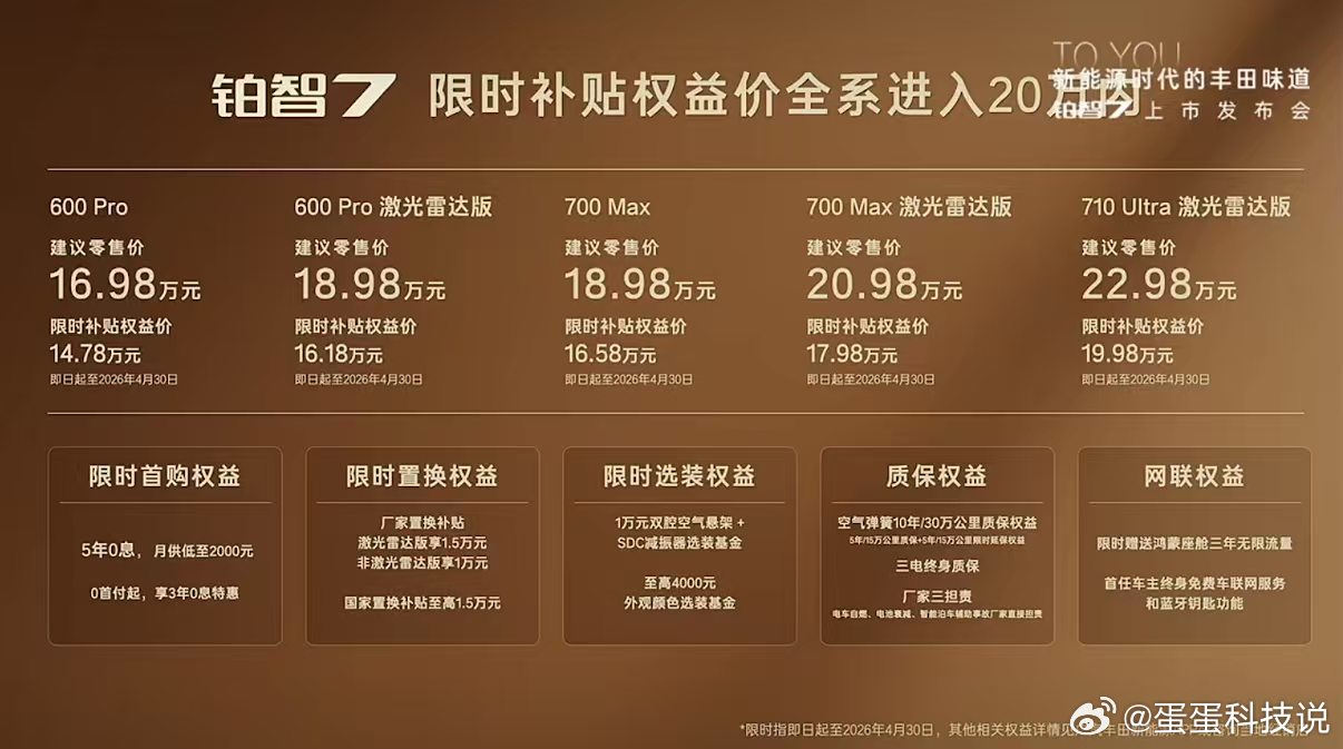 铂智7上市限时补贴权益价14.78万起 来啦!期待了好久的铂智7最终价格14.78w—19.98万元,比我想象的还要便宜。另外,铂智7还提供五年0息0首付的购车方案,这个价格可以说是打遍合资车无敌手了,20万内应有尽有,感觉新势力里头同级应该也没几个敢拼一拼的,铂智7这价格太狠了。丰田铂智7限时补贴权益全系20万内
