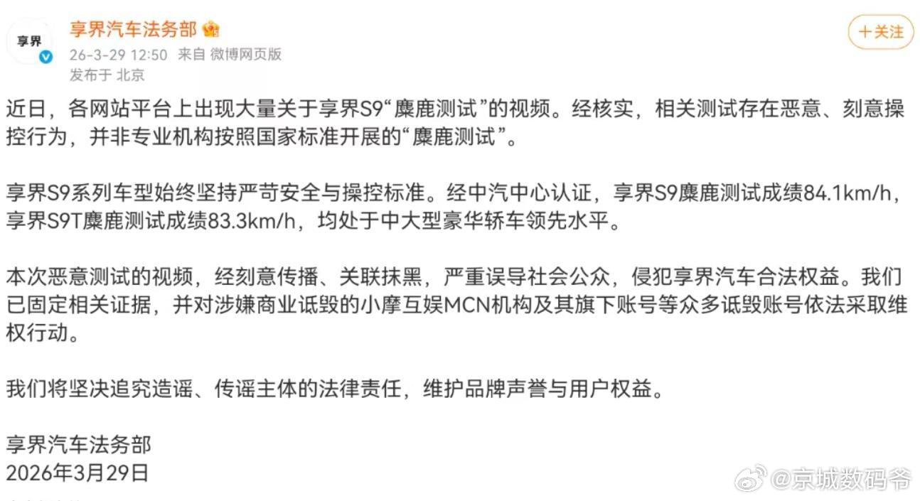 前几天很多人讨论的那个麋鹿测试享界法务部已经发声明了这种低劣的手段造谣,太无脑了