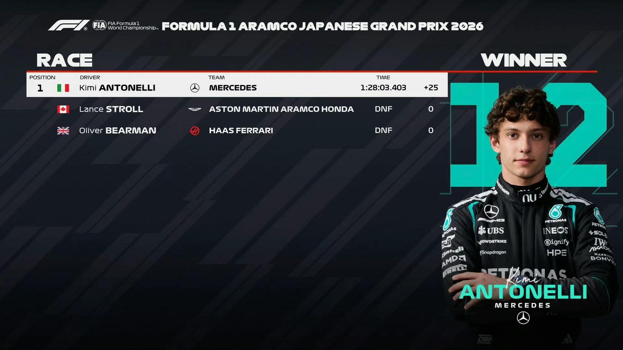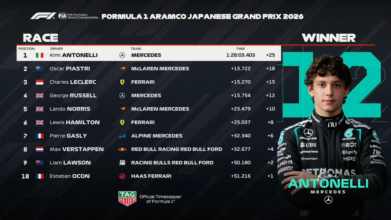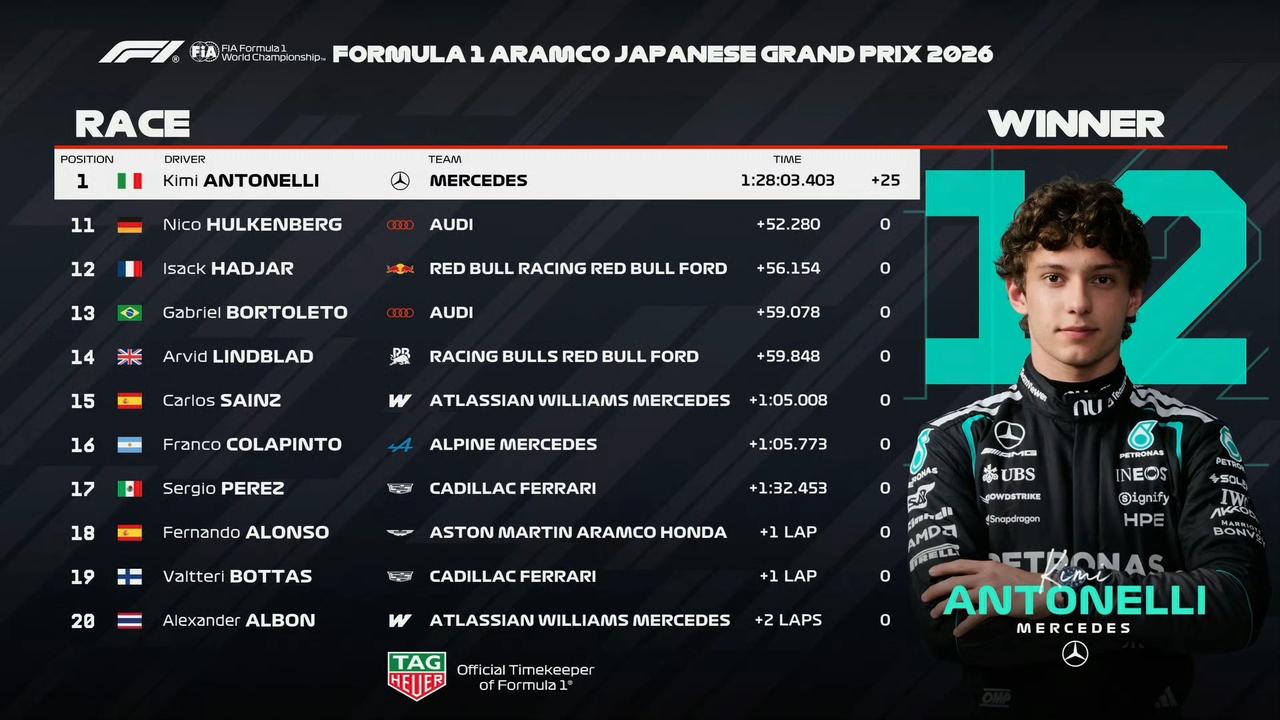 2026F1日本大奖赛正赛,安东内利拿下个人第二个分站冠军,同时登顶车手积分榜。