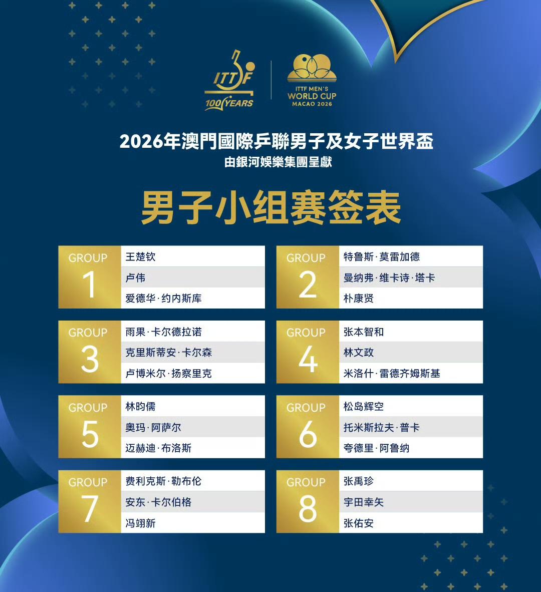 2026澳门国际乒联单打世界杯男单第一阶段分组新鲜出炉: 王楚钦独守上半区,而