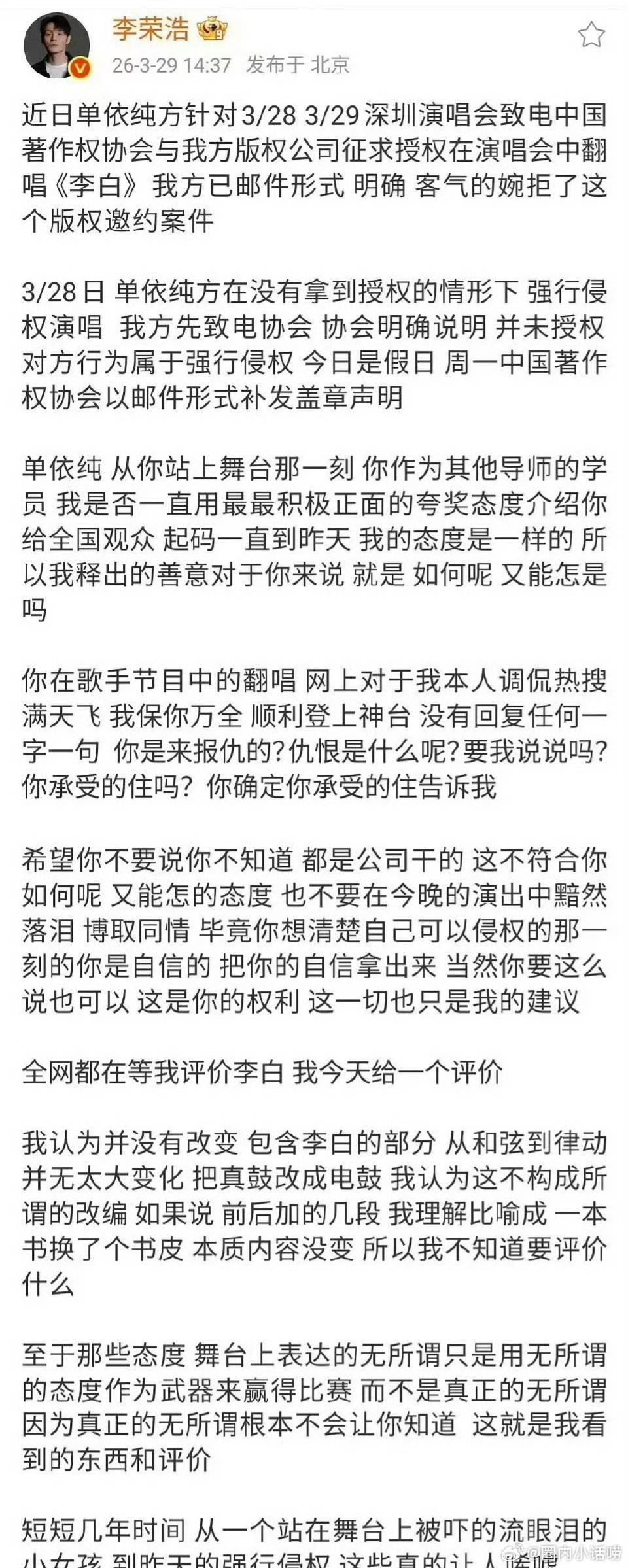 单依纯原来唱李白是侵权啊?李荣浩发长文点名了,还说“你是来报仇的吗?仇恨是什么?要我说说吗?你承受得住吗?”