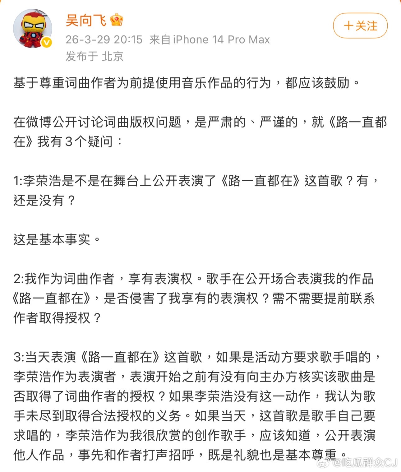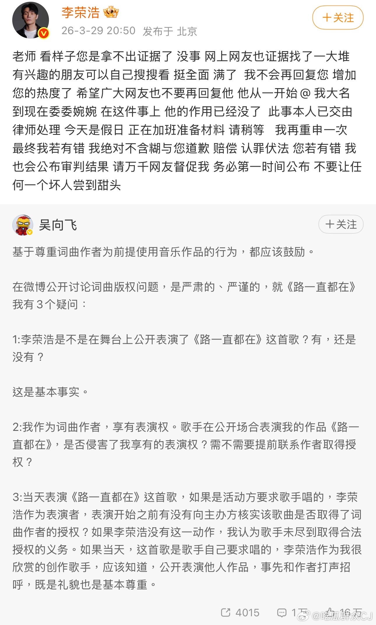 吴向飞没有正面回应李荣浩的问题,再发文只是重申李荣浩在公开舞台表演《路一直都在》应该提前联系作者要授权,如果被要求演唱也应该向主办方核实授权问题。
