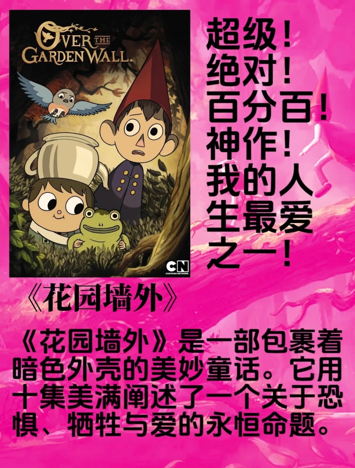 3、《花园墙外》讲述沃特和葛瑞格兄弟俩在神秘森林寻找归途的奇幻冒险。他们邂逅会说话的蓝鸟、阴郁的樵夫与诡谲的南瓜人……最后在迷雾中直面恐惧,读懂爱与牺牲的深意。《花园墙外》是一部包裹着暗色外壳的美妙童话。它用十集美满阐述了一个关于恐惧、牺牲与爱的永恒命题。看到最后,美好的人全都得到善终的happy ending时,我心里的喜悦就像瞬间绽开的烟花那样。总结:超级!绝对!百分百!神作!我的人生最爱之一!4、《怪诞小镇》围绕双胞胎姐弟俩梅宝和迪普暑假来到名叫“重力泉”的偏远小镇后发生的千奇百怪故事展开。很诙谐很有趣很可爱!