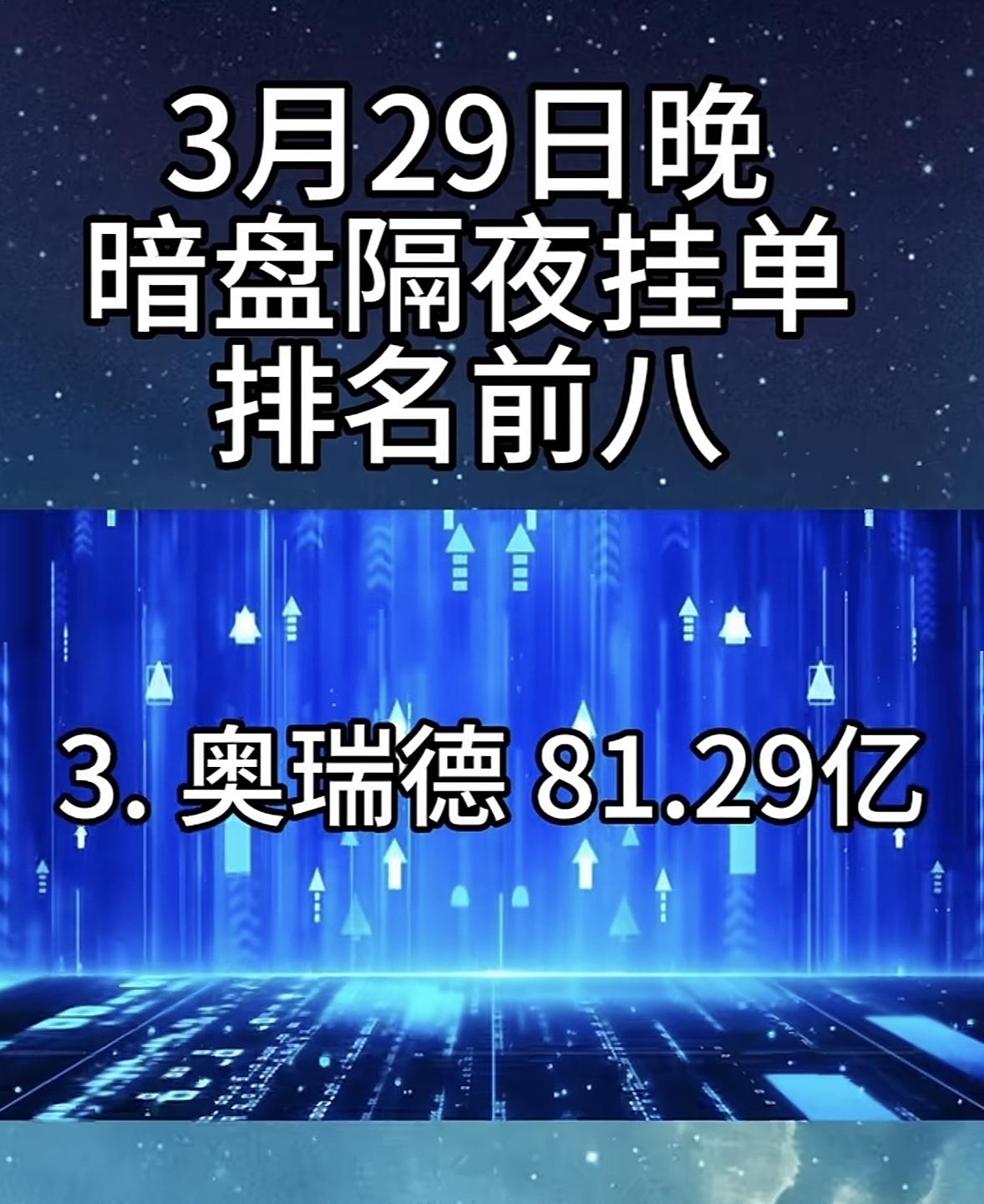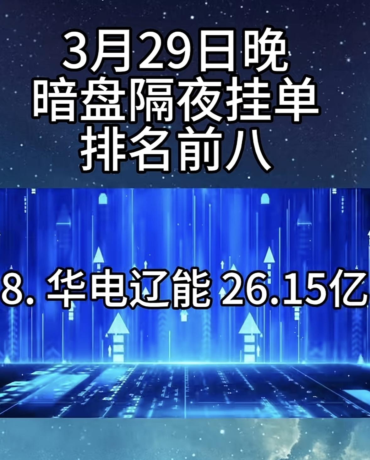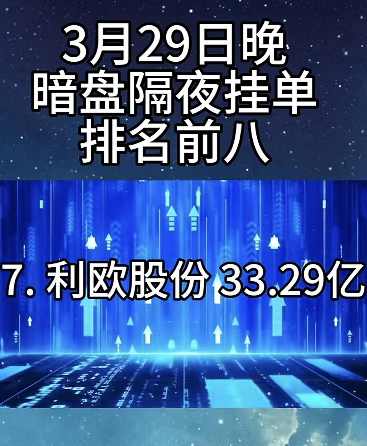 3月30日周一暗盘隔夜挂单排行榜揭晓 3月29日晚暗盘隔夜挂单排名前八,利欧股份以33.29亿挂单量引人注目。此前2月3日利欧股份挂单就达67.33亿,它是水泵领域老牌企业,还布局数字营销等业务,足见资金关注度高。 之前周末暗盘隔夜单排名里,利欧股份也以39.18亿挂单领跑,它沾着文化传媒、AI营销和液冷概念,都是当下市场热点。不过挂单多不代表股价一定涨,市场复杂多变。像鲁信创投、金风科技等也有大量挂单,反映出资金对不同板块的布局意愿。咱普通人投资不能盲目跟风,得看清背后逻辑,守好风险底线。