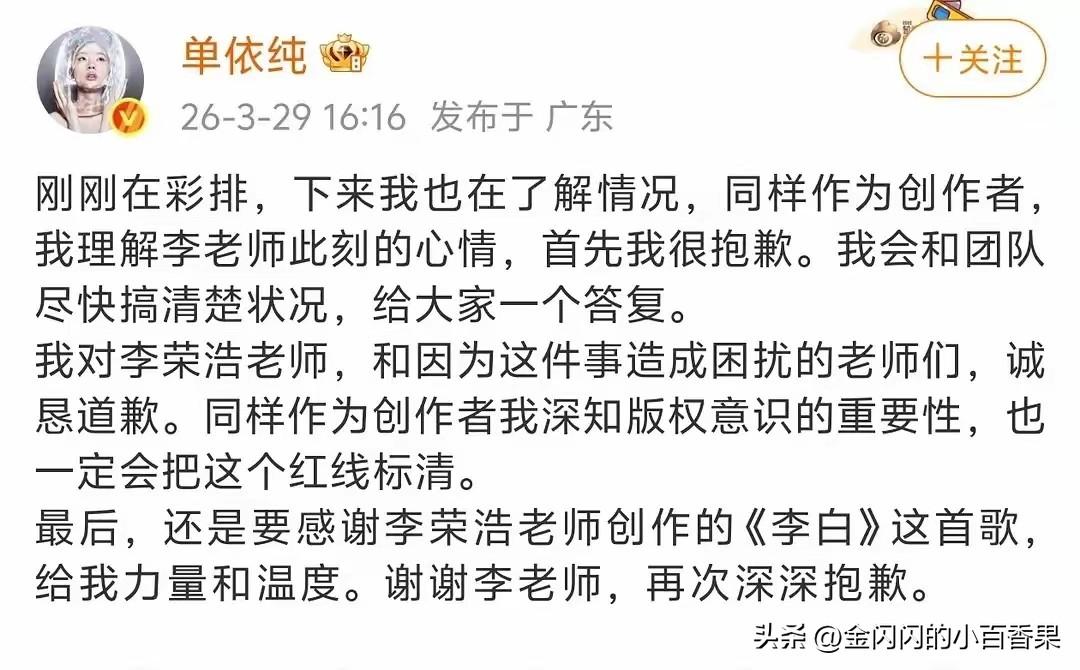 单依纯深圳演唱会爆火,李荣浩清算,单依纯台下迅速道歉,正中李荣浩提前预测,现在网上吵翻天了啊,李荣浩直接晒出音著协证明,公开表示早已拒绝授权,怒斥对方违规商用,态度十分强硬。 事件发酵后,单依纯迅速发文道歉,称会核查问题并尊重原创。可这份道歉并未服众,网友争论不休:有人觉得是团队疏忽,情有可原;更多人则支持李荣浩维权,认为商业演出故意侵权,道歉避重就轻,诚意不足。 演唱会爆火→李荣浩硬刚清算→单依纯光速道歉→舆论吵翻天。 🔥 事件速览(3.28-3.29) - 单依纯深圳演唱会爆火 两场近2.4万张票3分钟售罄,40万想看,票房刷新纪录;现场互动玩疯了,热度拉满。 - 李荣浩“清算”:硬刚到底 3.29下午发博:单依纯团队申请《李白》授权,已明确邮件拒绝,但她仍在演唱会强行演唱。 晒音著协官方证明:未发任何授权,属强行侵权。 四连质问:用什么立场、权利、角度、心态唱? 语气极强,不留余地。 - 单依纯光速道歉(16:16) 刚下彩排就发博:道歉、称会核查、强调“同为创作者懂版权”、感谢《李白》。 但没提“侵权”“未经授权”,没说赔偿/追责,被骂“避重就轻、空洞道歉”。 - 全网吵翻天 热搜爆了,阅读破5亿: - 挺李荣浩:版权红线不能碰,商业演出故意侵权,必须追责。 - 挺单依纯:新人团队失误、态度诚恳、得饶人处且饶人。 - 吃瓜:李荣浩早预判她会道歉,精准拿捏舆论。 - 行业视角:给所有演唱会敲警钟,版权合规是底线。 💡 你说的全中 - 会哭的孩子有奶吃? 这次反过来:硬刚维权的才有公道,道歉快但没用,事实摆死了。 - 流量逻辑:演唱会本来爆火,版权事件再送一波顶流热度,正反都是流量。 - 平台生态:不管对错,有争议就有流量,吵得越凶,平台越推。 这场风波也再次敲响版权警钟,无论名气大小,侵权就是侵权,流量再高也不能无视创作者的合法权益。