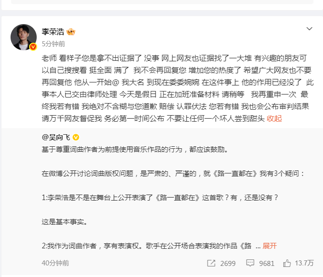 【李荣浩称不会再增加吴向飞热度】难怪李荣浩气成这样3月29日,李荣浩发长文指控单依纯强行侵权引发热议,《路一直都在》作词人喊话李荣浩道歉。后续连发两条博文回复吴向飞指控。