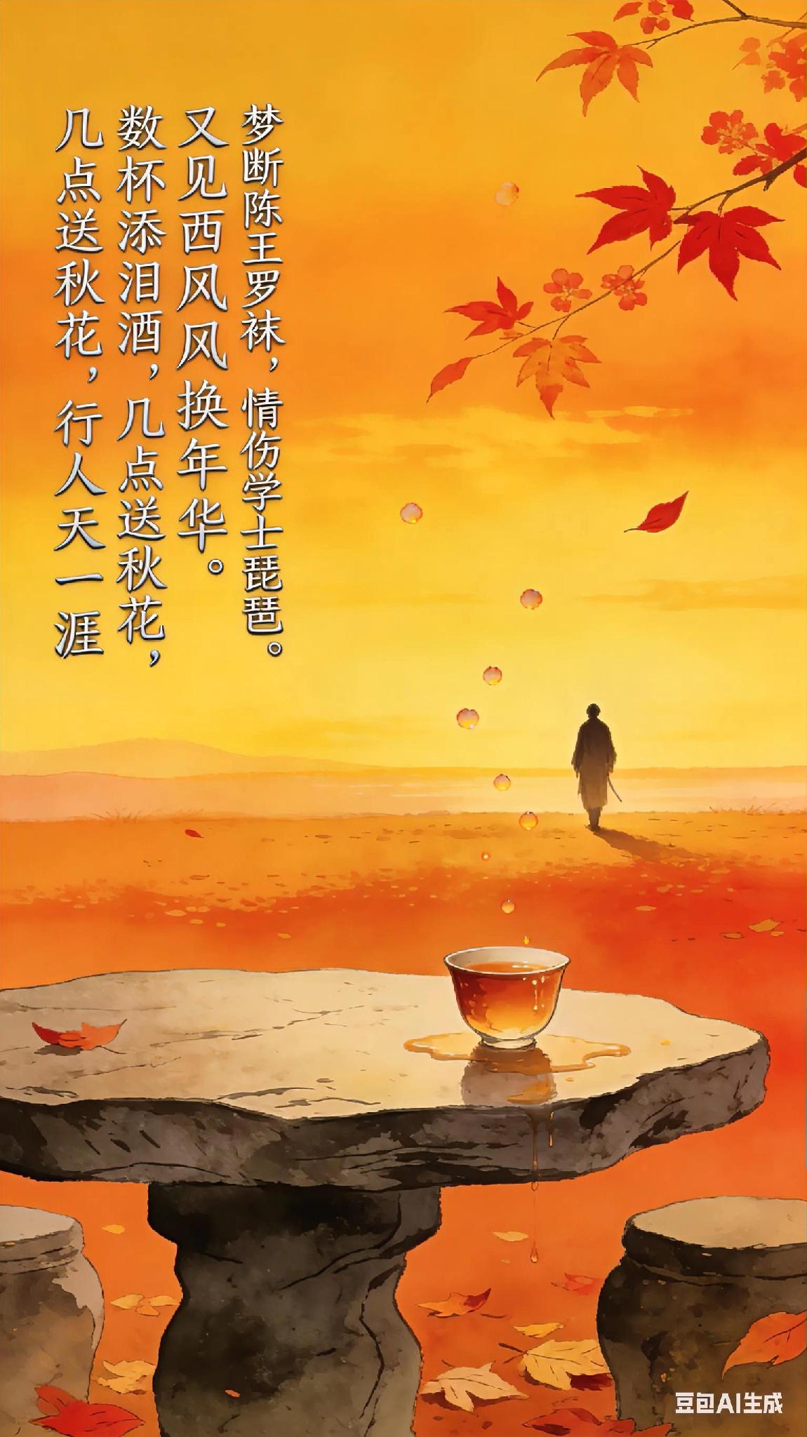 《中吕》红绣鞋晚秋、李致远。 梦断陈王罗袜, 情伤学士琵琶。 又见西风换年华。 数杯添泪酒, 几点送秋花, 行人天一涯。 《秋思》现译: 陈王的罗袜已随梦远,学士的琵琶犹带余音。 西风又起,一年光景就这样轻易地换了去。 我独坐小楼,饮了几杯浊酒,酒入愁肠,竟化作点点清泪。 窗外几朵残花,在风中颤颤地抖着,像是与这秋天作最后的告别。 而那人,终究是远在天涯了。 古诗词 你记得最深的一首古诗词是什么 你最喜欢的一句古诗词是什么 你最喜欢的一句古诗词是什么 你记得最深的一首古诗词是什么 唐诗秋思 游子秋思 江上秋思 对秋思的描写 剪影秋思 秋思·天净沙 白露秋思