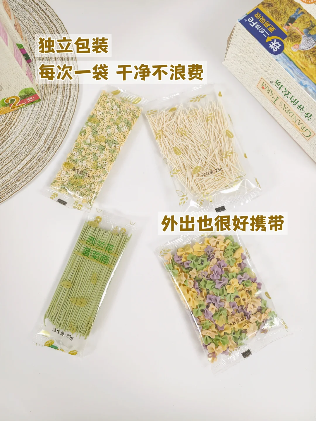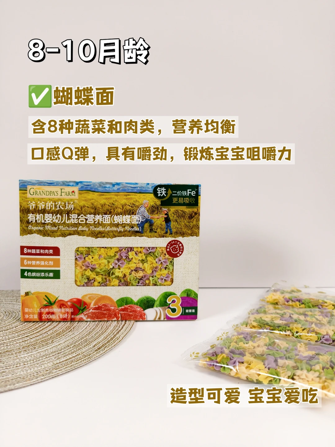 初添加可以选择他家的原味短面和粒粒面,口感软糯好吞咽,7-8月龄直接过渡到色彩丰富🌈的长直面,9-10月龄选择造型可爱、Q弹有嚼劲的蝴蝶面🦋&造型面,每个月龄都给安排得明明白白,非常省心