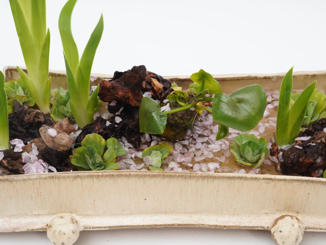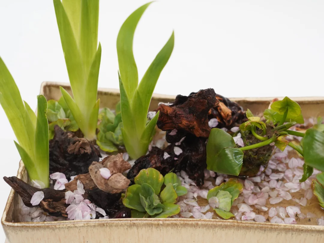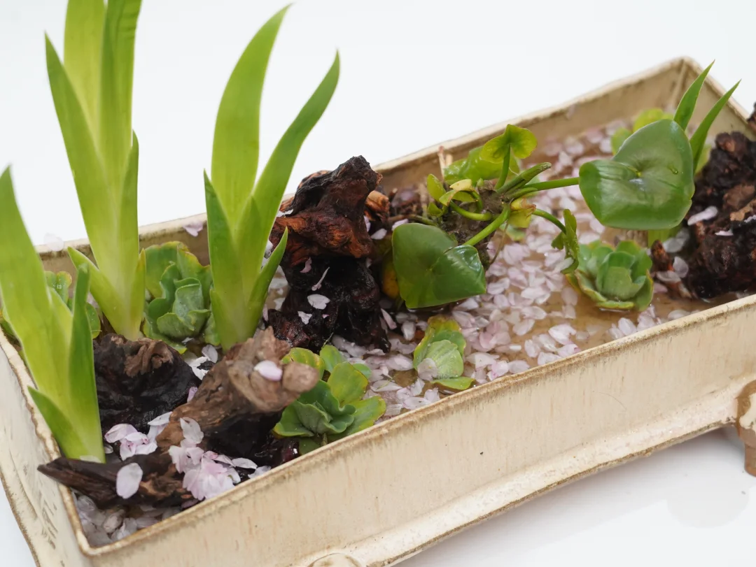 刚出芽的鸢尾叶沉浸在樱花花瓣的花筏之中,未见樱花树,但却可想象溪流之上樱花的璀璨落幕,随风而逝。