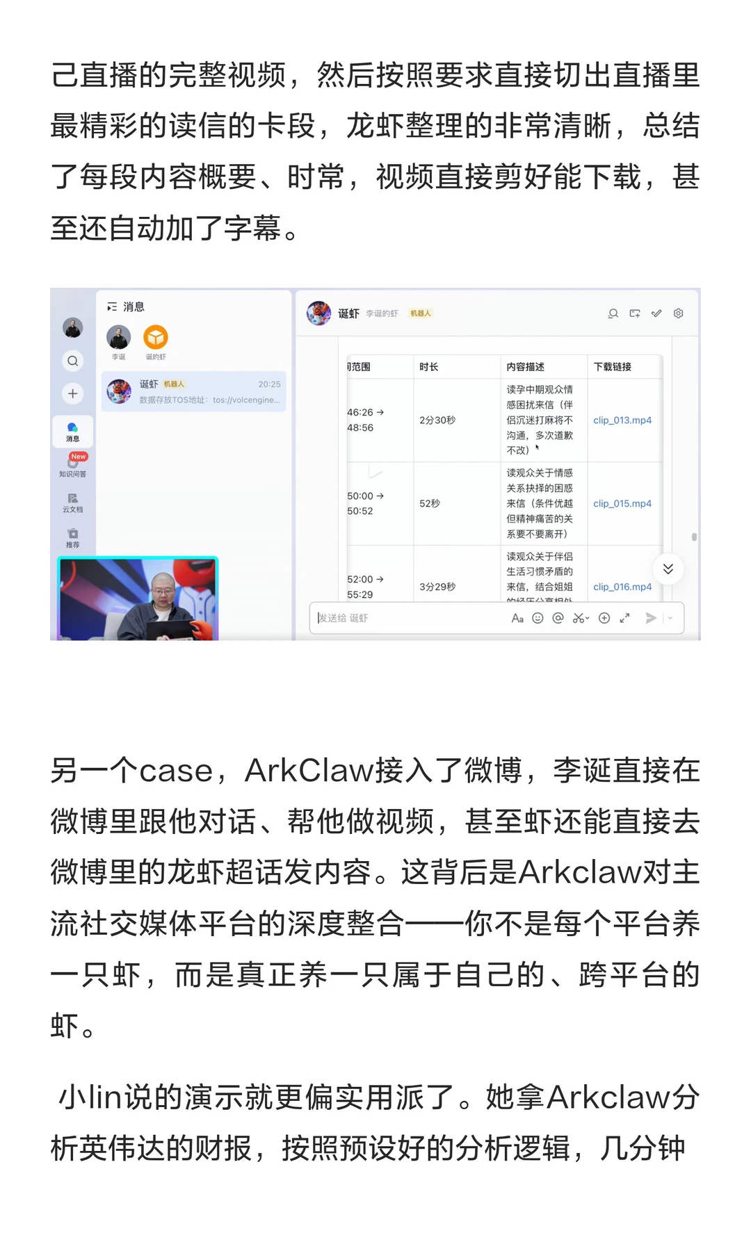 另一个case,ArkClaw接入了微博,李诞直接在微博里跟他对话、帮他做视频,甚至虾还能直接去微博里的龙虾超话发内容。这背后是Arkclaw对主流社交媒体平台的深度整合——你不是每个平台养一只虾,而是真正养一只属于自己的、跨平台的虾。