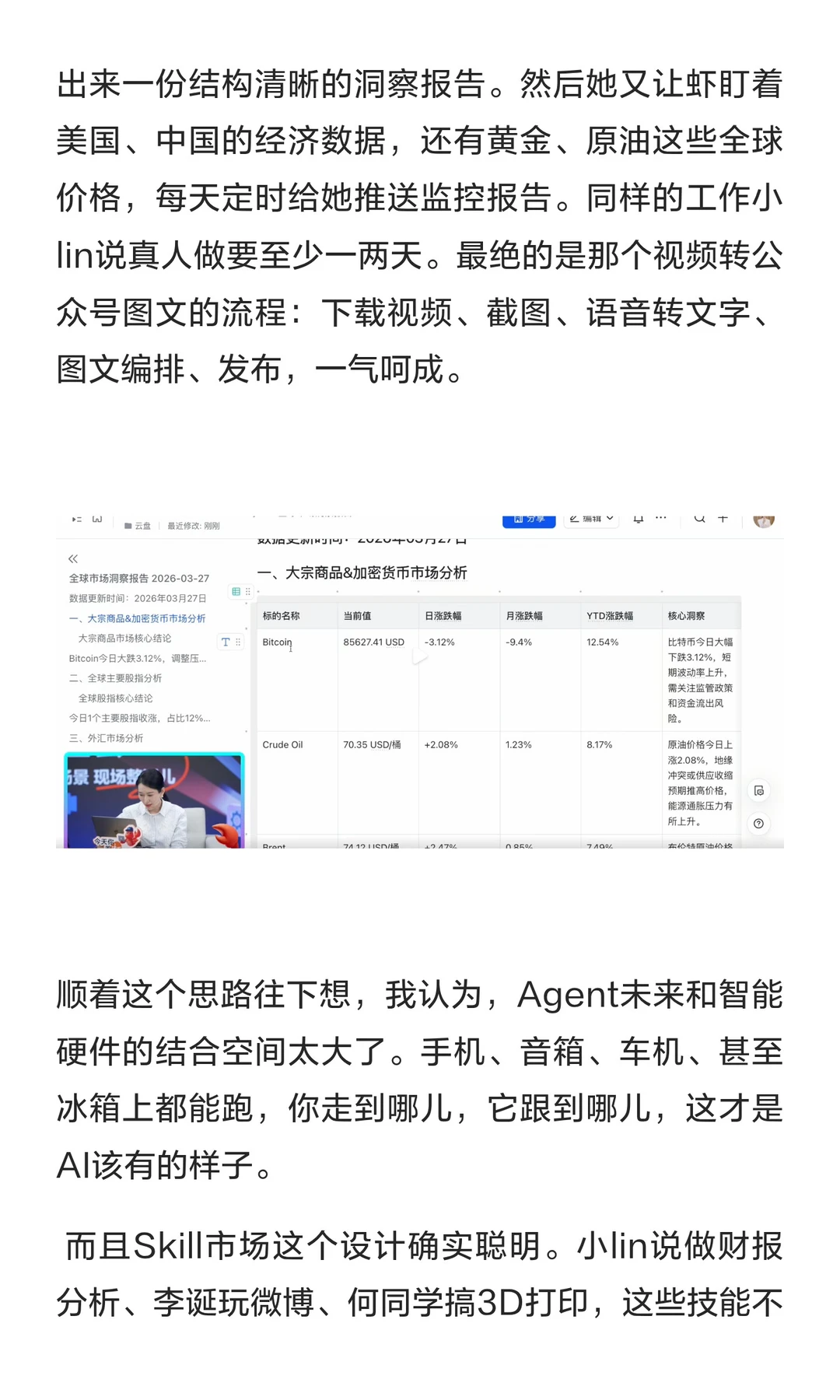 小lin说的演示就更偏实用派了。她拿Arkclaw分析英伟达的财报,按照预设好的分析逻辑,几分钟出来一份结构清晰的洞察报告。然后她又让虾盯着美国、中国的经济数据,还有黄金、原油这些全球价格,每天定时给她推送监控报告。同样的工作小lin说真人做要至少一两天。最绝的是那个视频转公众号图文的流程:下载视频、截图、语音转文字、图文编排、发布,一气呵成。