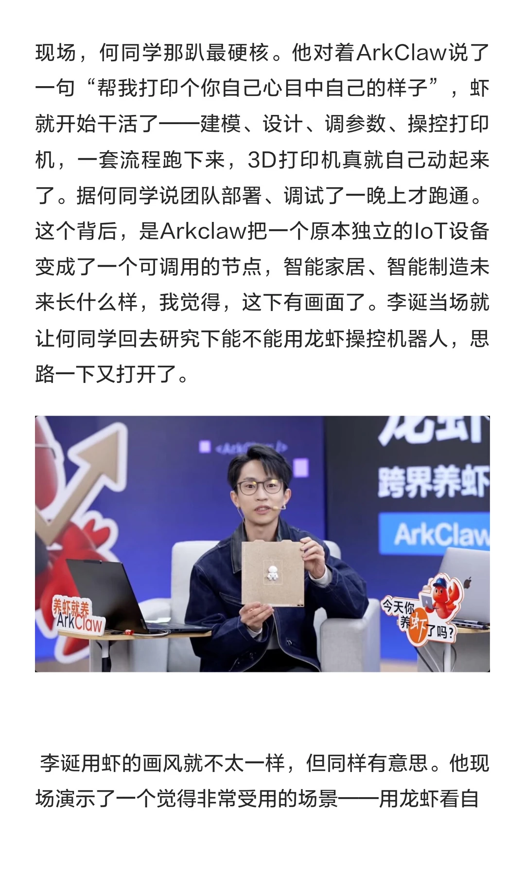 ArkClaw是火山的云端部署版OpenClaw。直播现场,何同学那趴最硬核。他对着ArkClaw说了一句“帮我打印个你自己心目中自己的样子”,虾就开始干活了——建模、设计、调参数、操控打印机,一套流程跑下来,3D打印机真就自己动起来了。据何同学说团队部署、调试了一晚上才跑通。这个背后,是Arkclaw把一个原本独立的IoT设备变成了一个可调用的节点,智能家居、智能制造未来长什么样,我觉得,这下有画面了。李诞当场就让何同学回去研究下能不能用龙虾操控机器人,思路一下又打开了。