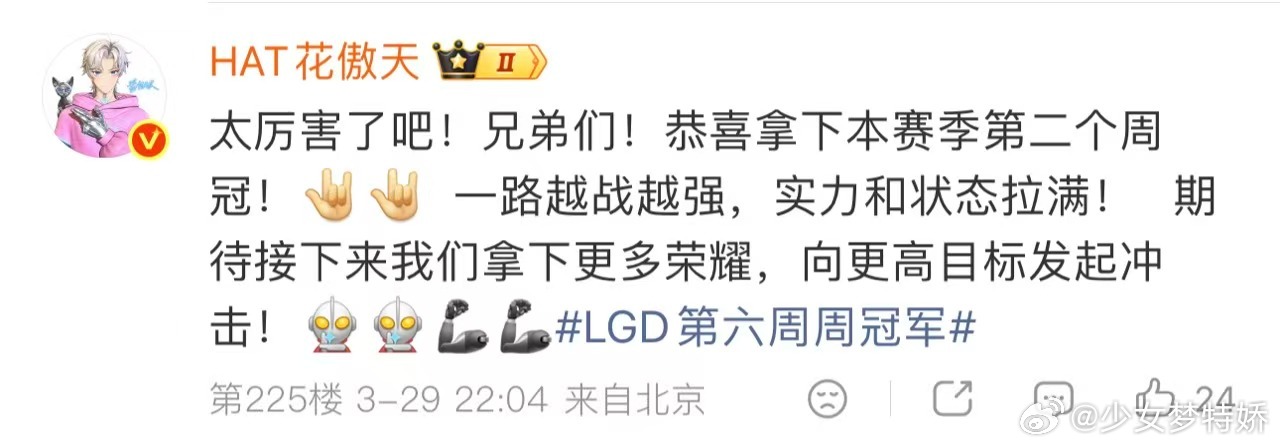 花傲天期待LGD拿下更多荣誉恭喜LGD拿下周冠!花傲天送上祝福,期待队伍保持状态