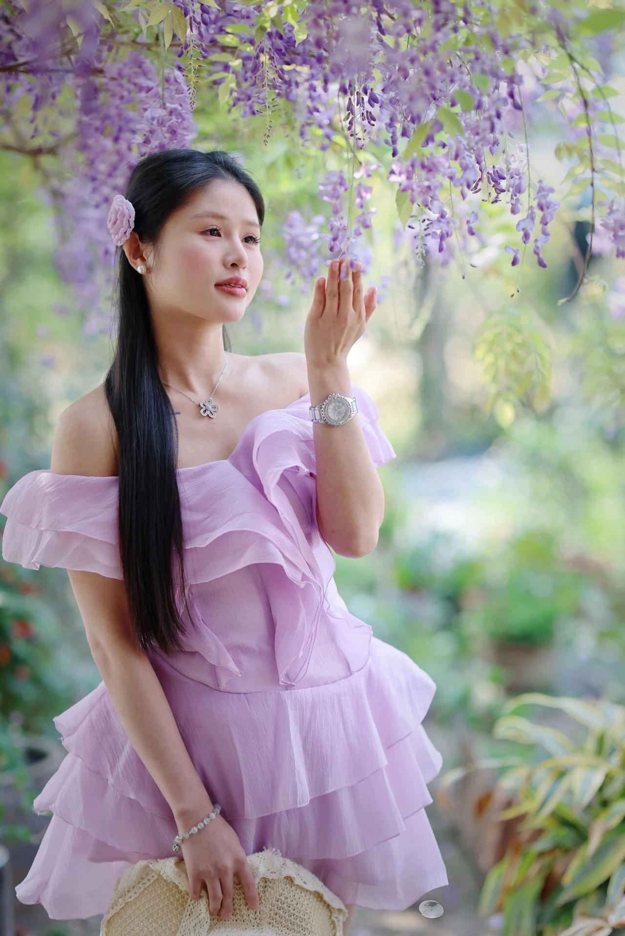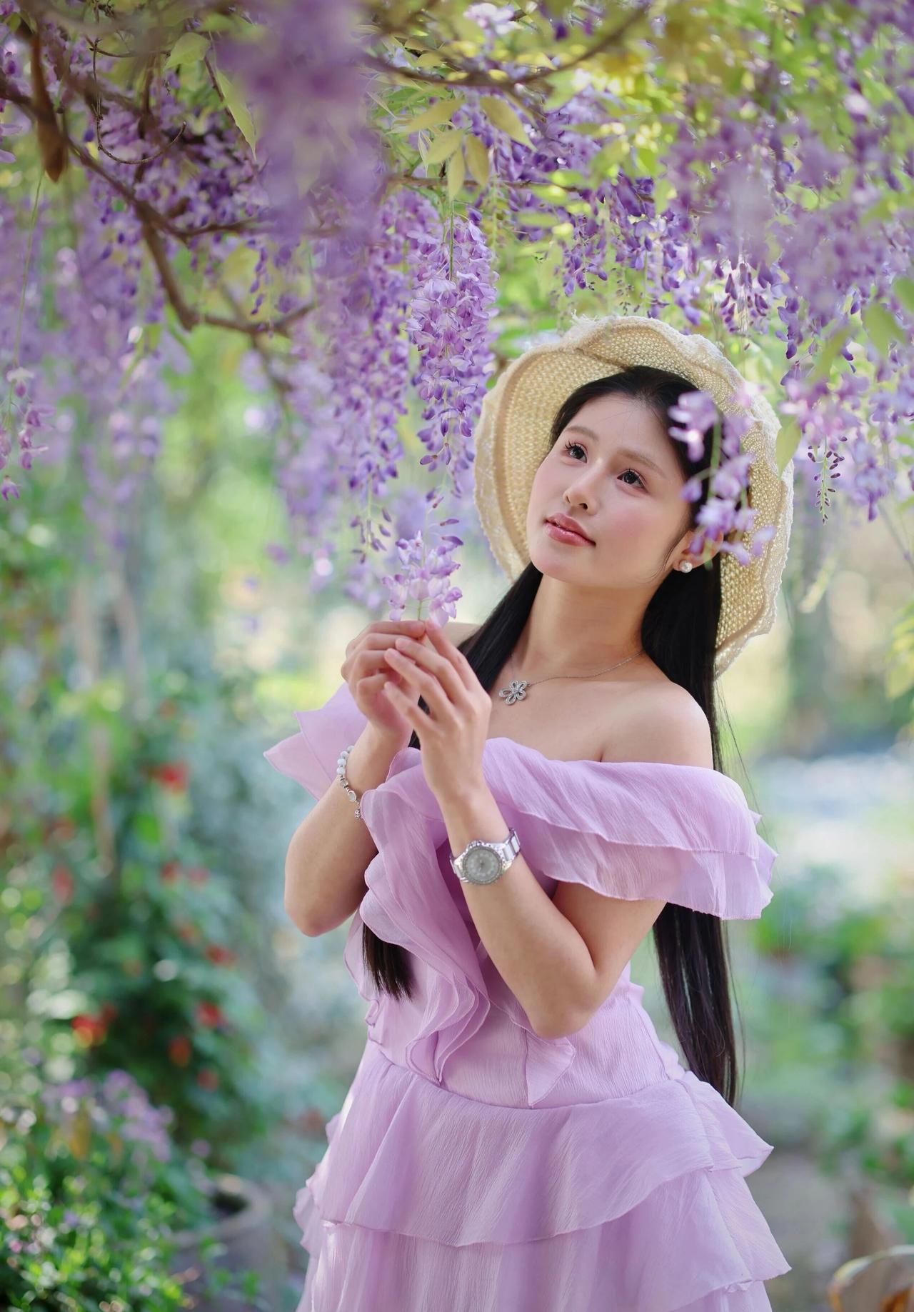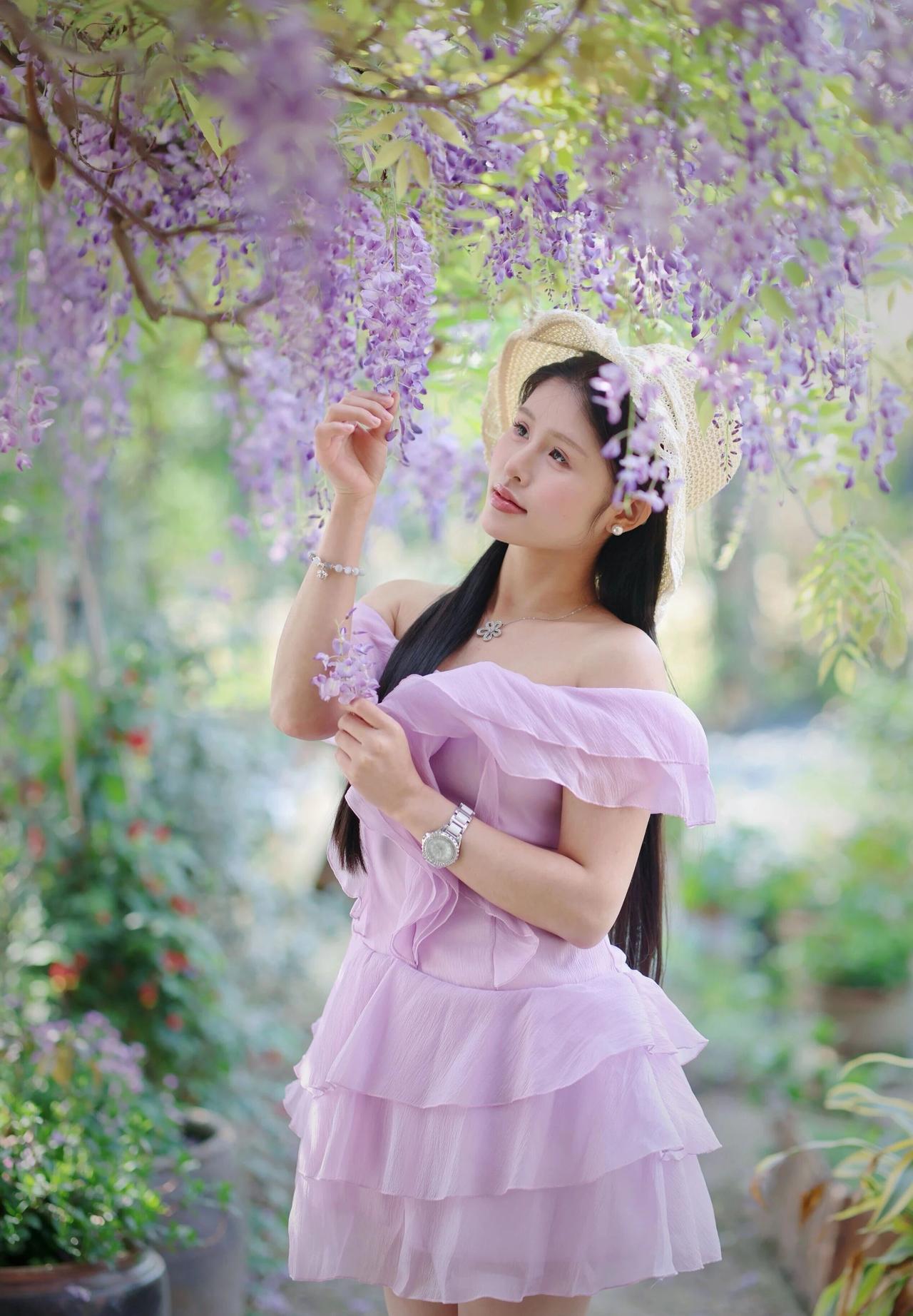 今年春天最想实现的心愿春日紫藤花架下,佳人一袭淡紫色一字肩蛋糕裙,层层叠叠的褶皱轻盈灵动,衬得肌肤胜雪。乌黑长发如瀑垂落,时而别着同色系花饰,时而搭配一顶草编帽,尽显温柔浪漫。她或轻捻花枝,或仰头凝望,眉眼间满是温婉恬静,与垂落的紫花相映成趣,宛如误入人间的花仙子,将春日的浪漫与柔美演绎得淋漓尽致。