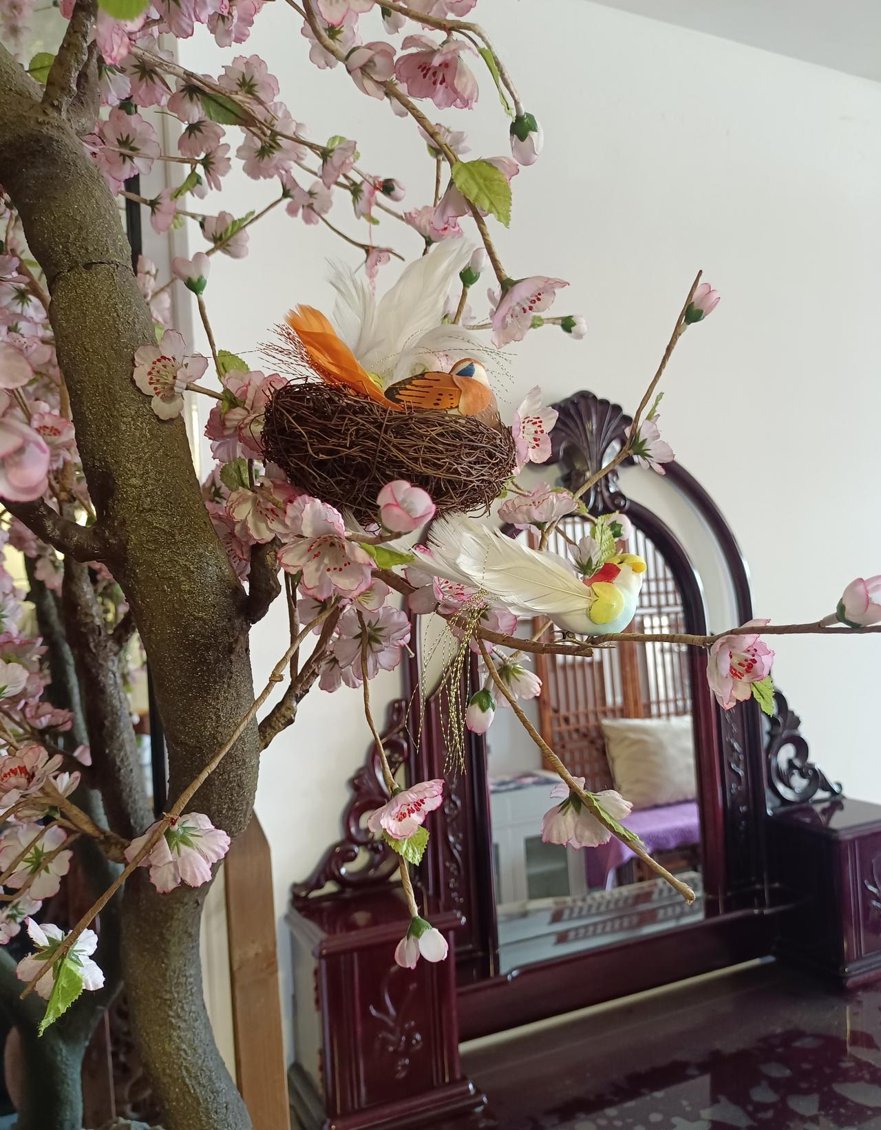 ▫️ 住进「诗意褶皱」里,打卡中式美学民宿 推开民宿的门,雕花屏风的纹样在光影里流转——榫卯咬合的弧度、镂空处漏下的天光,瞬间把都市的喧嚣关在了门外。 清晨被鸟鸣唤醒,阳光穿过屏风的格子,在地板上织出斑驳的网。坐在雕花围栏旁,看粉樱花的枝桠晃过玻璃柜,连空气都浸着古雅的香。 午后窝在屏风后的软榻,泡一壶茶,看光影在木纹里游走——这一刻突然懂了,中式美学不是陈设的堆砌,是时光在这里慢下来的温柔褶皱。 ▫️