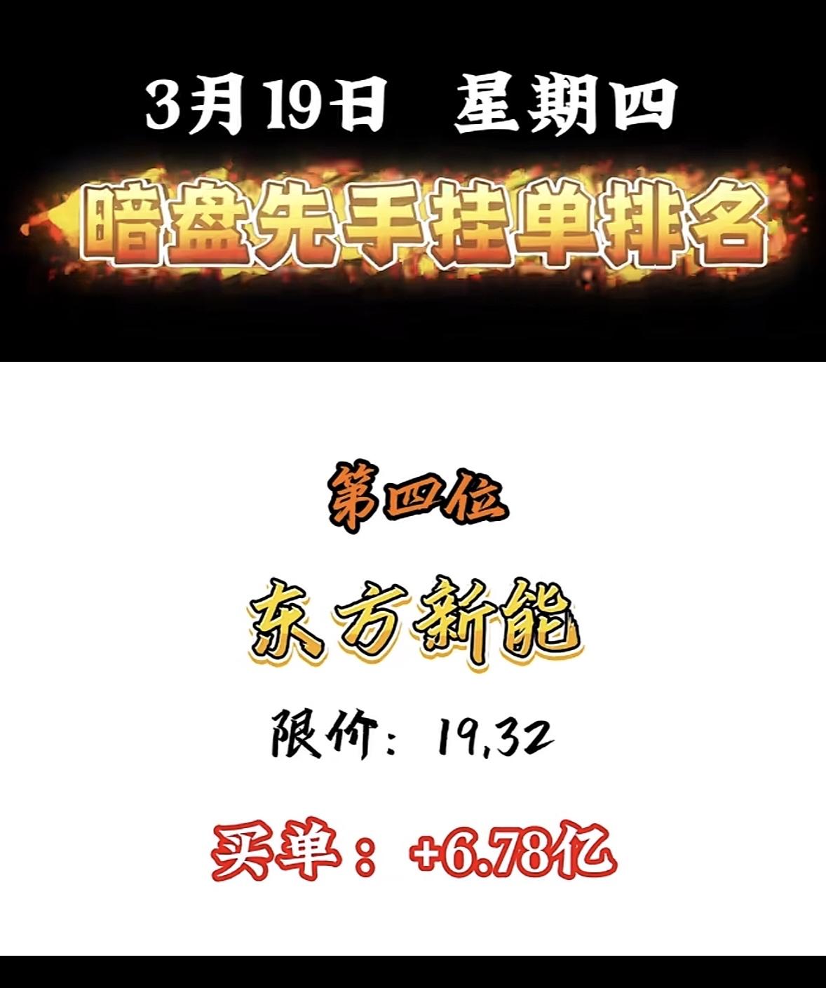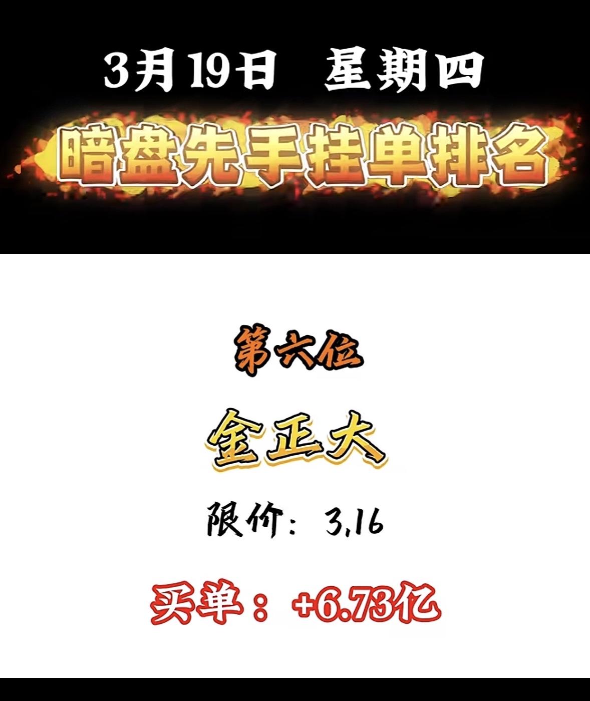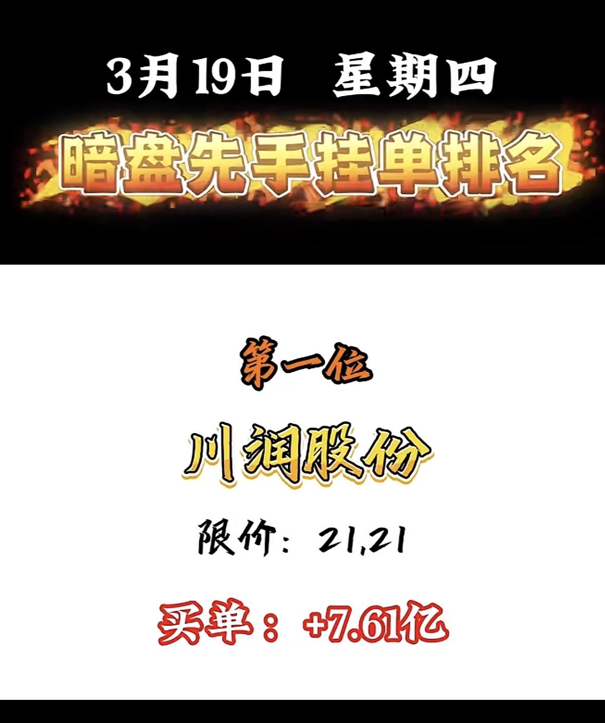 3月30日周一暗盘隔夜排行榜出炉 川润股份在暗盘先手挂单排名里领跑了,限价21.21,还有7.61亿的买进资金,这阵仗可不小!从历史数据看,2026年2月27日收盘价19.47,较之前有一定涨幅。和2月4日暗盘资金挂单排行里其他股票相比,像杭电股份3.26亿、白银有色3.47亿,川润股份这7.61亿的买进资金相当亮眼。不过股票这东西,有机会也有风险。川润股份这次领跑,后续走势是继续高歌猛进,还是会有变数,咱就拭目以待吧!