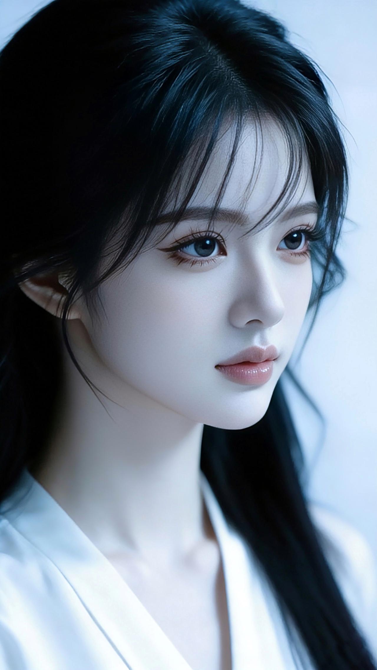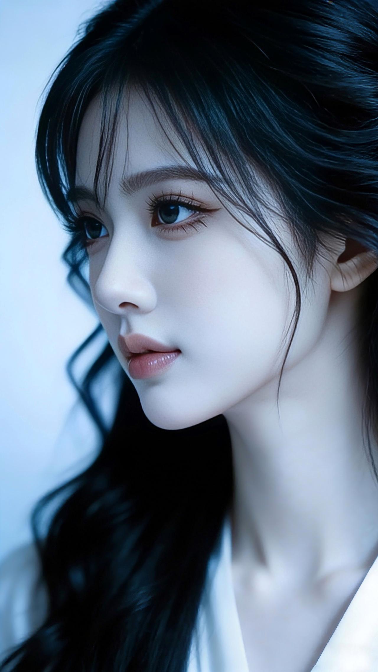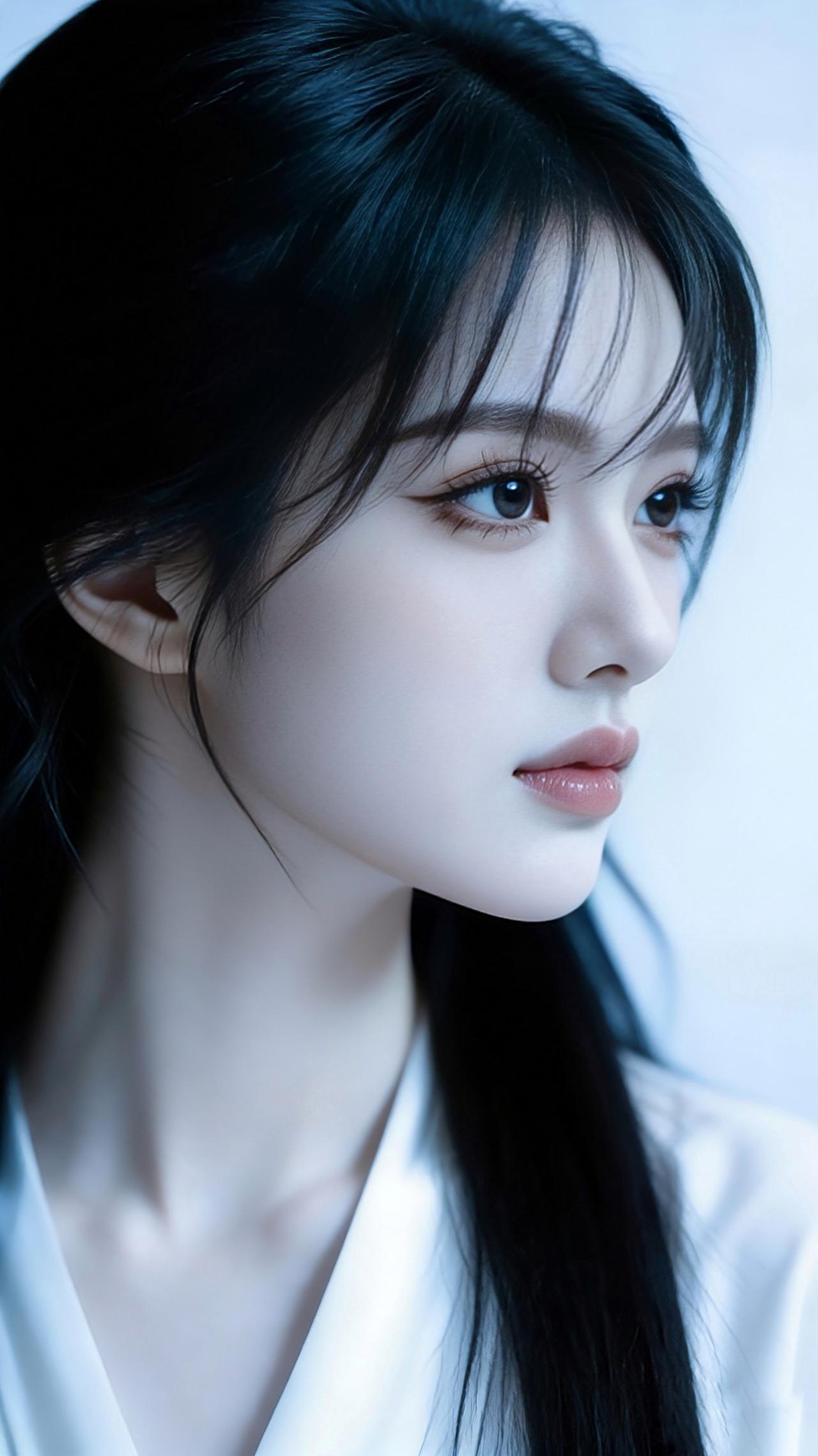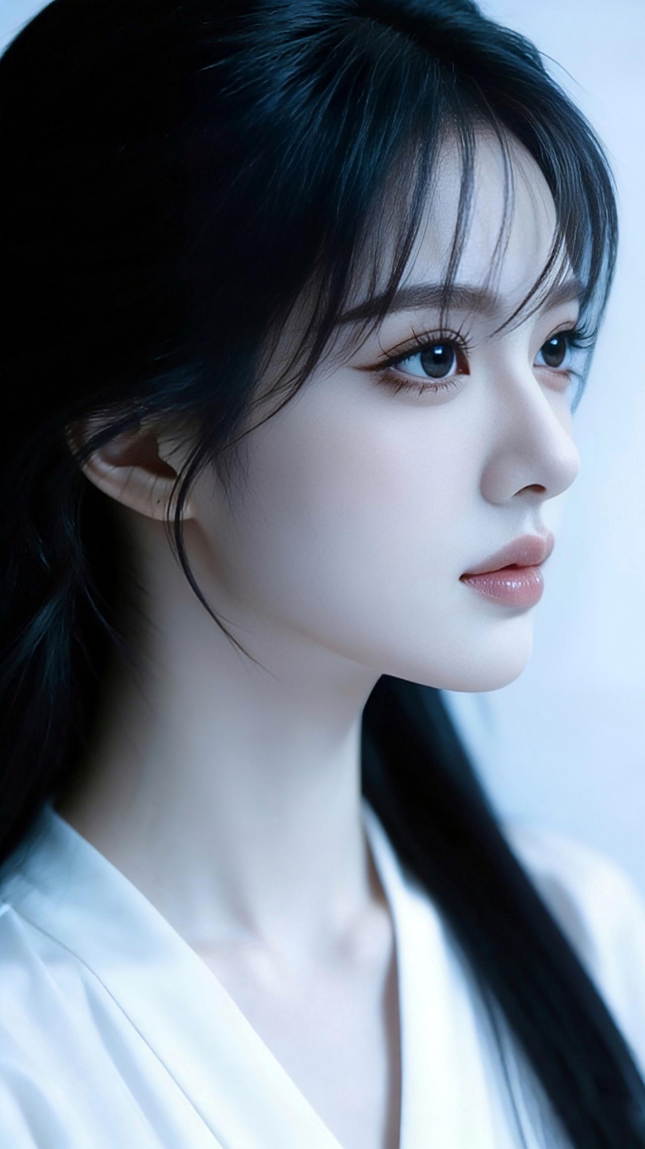 九帧同绘侧颜仙!乌发如瀑垂落泛柔光,眸藏星辰似清泉,粉唇似樱映雪肌。白V领衫衬颈线,浅蓝背景织静谧。温婉空灵如古典画,一眼沦陷心尖! 图片为A l辅助完成,请注意甄别!