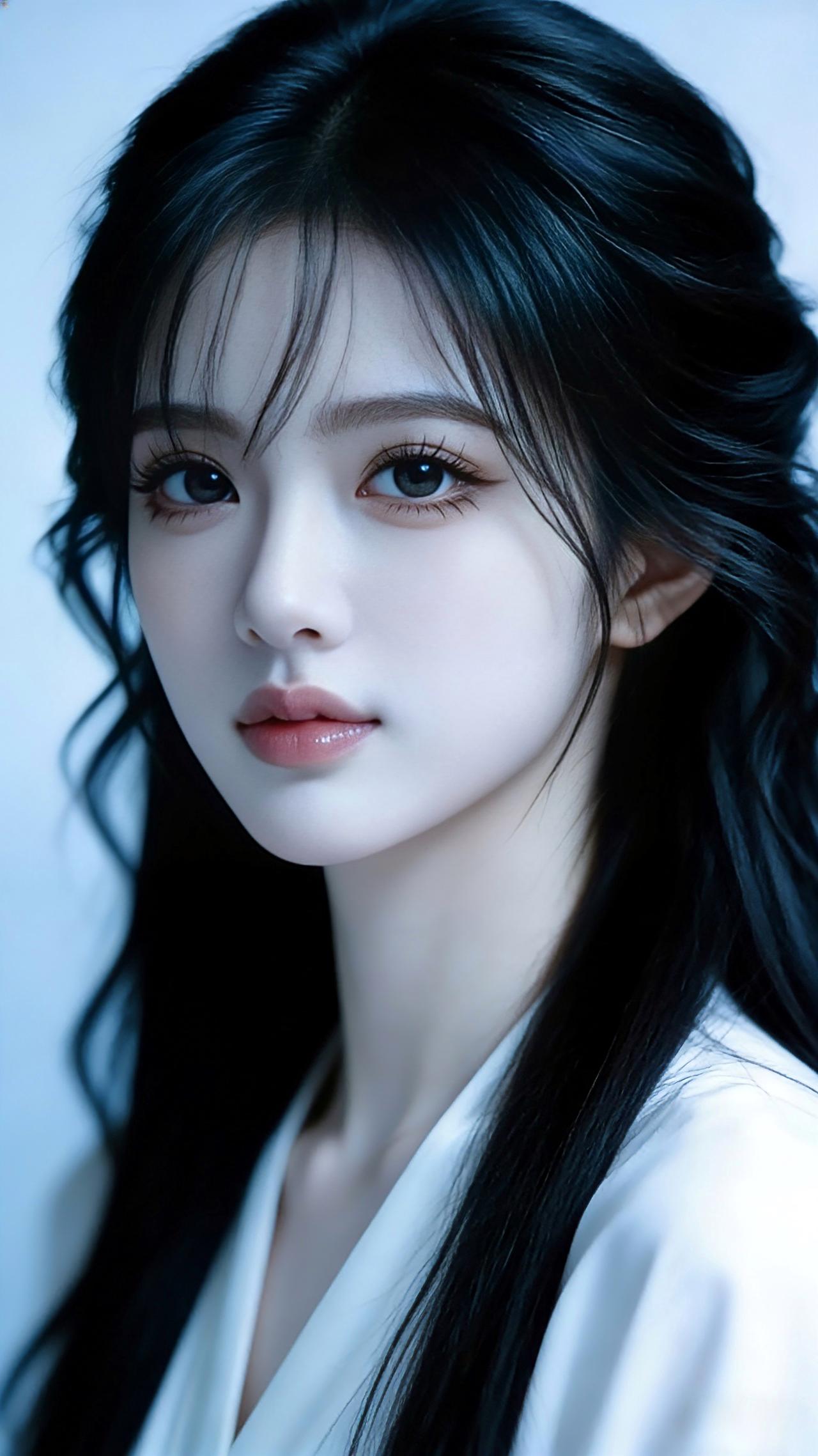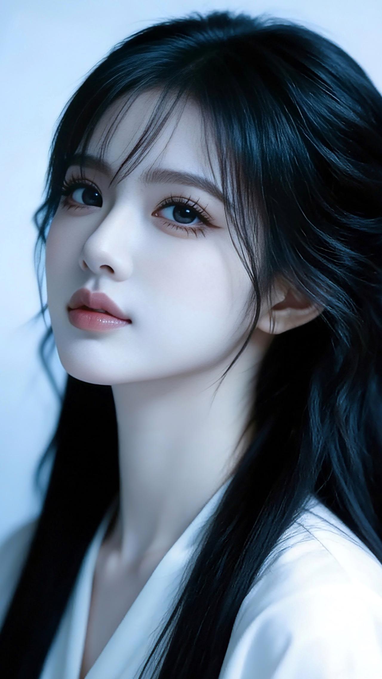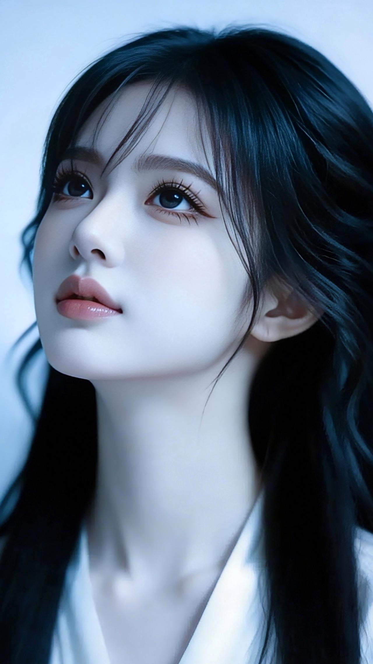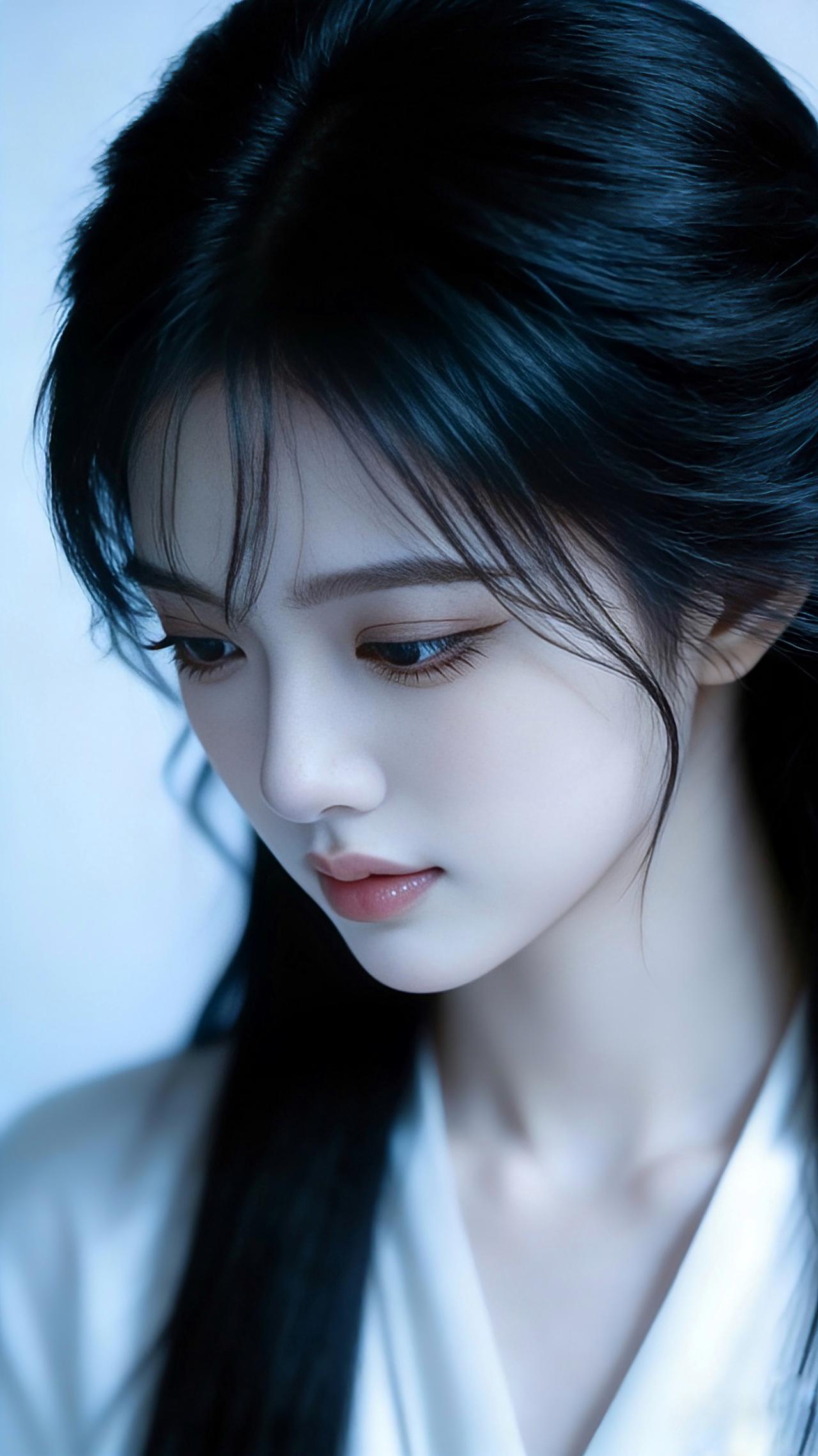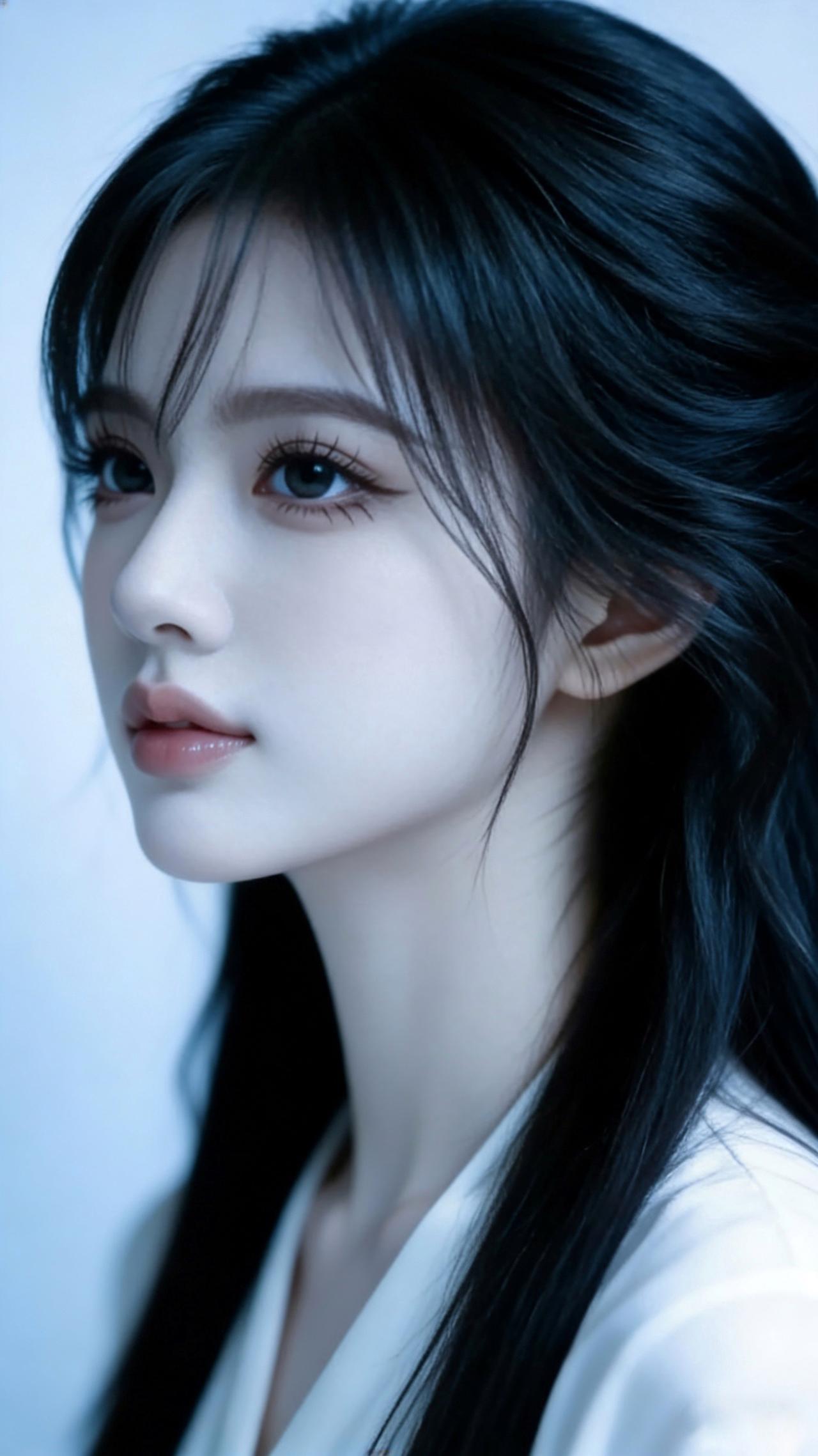 九帧同绘侧颜仙!乌发如瀑垂落泛柔光,眸藏星辰似清泉,粉唇似樱映雪肌。白V领衫衬颈线,浅蓝背景织静谧。温婉空灵如古典画,一眼沦陷心尖! 图片为A l辅助完成,请注意甄别!