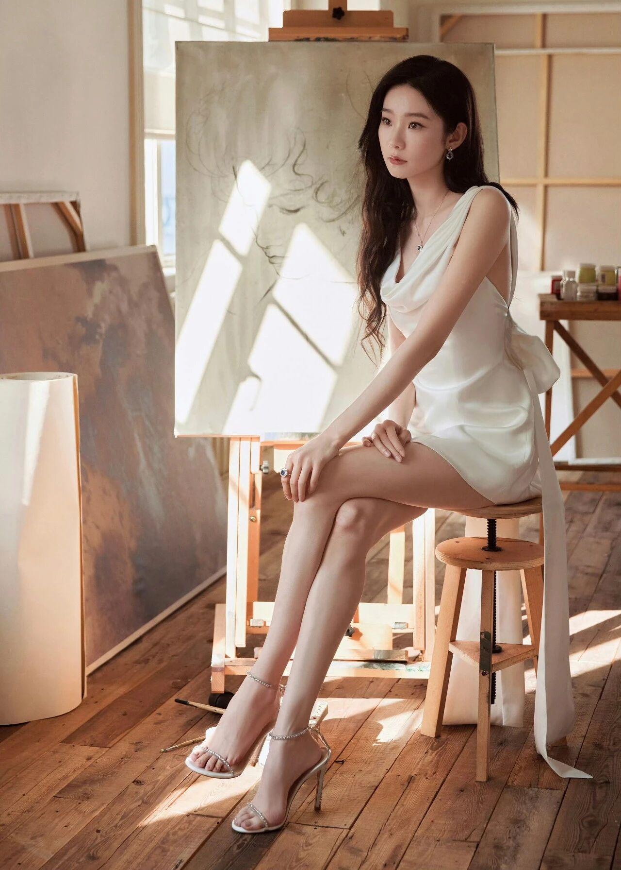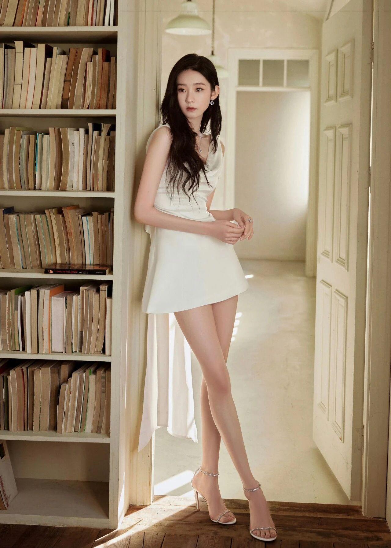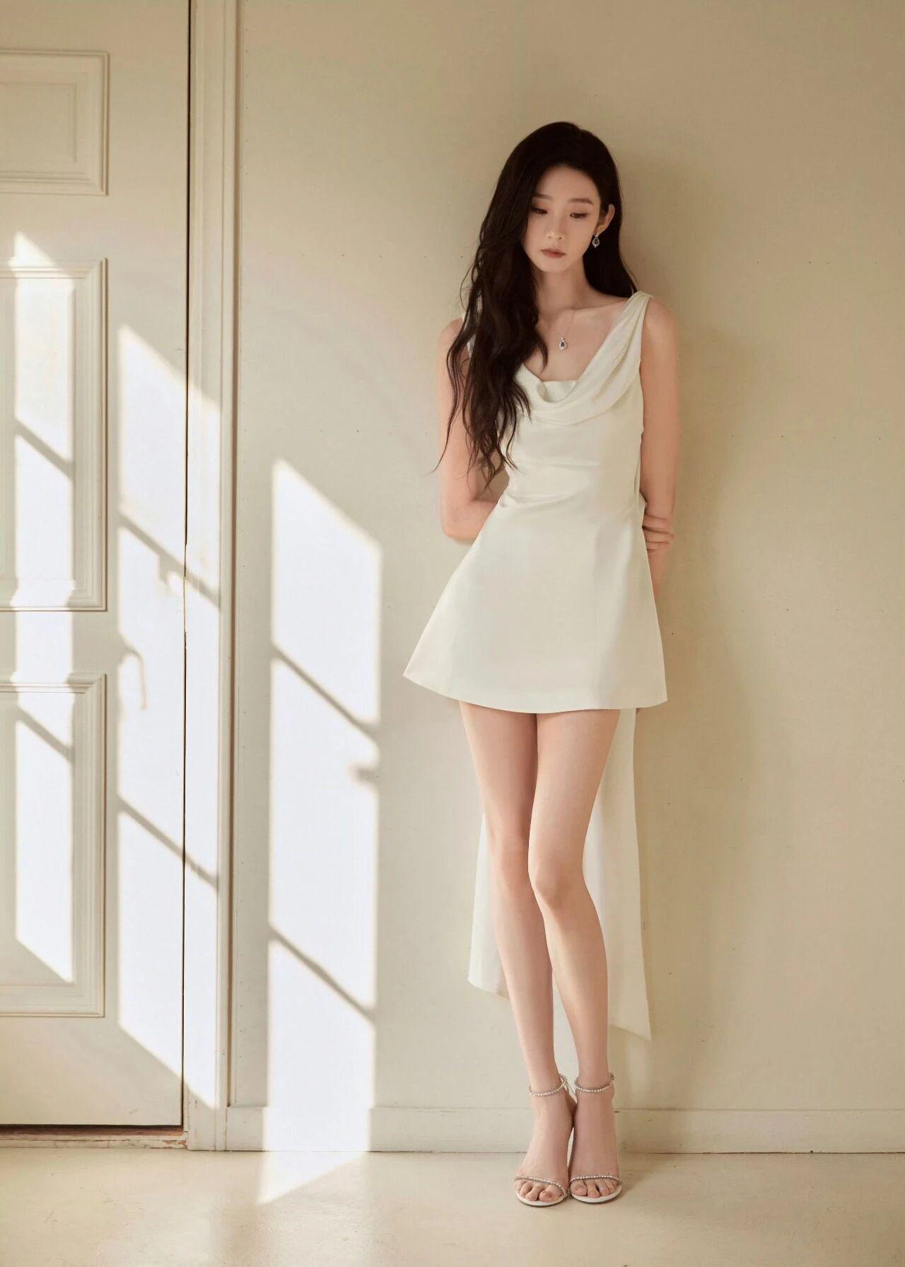 服饰:一袭白色缎面无袖连衣裙,采用荡领设计,勾勒出优美的颈部线条;裙摆短款利落,后侧垂坠的长飘带增添灵动感,简约中透着性感与优雅。