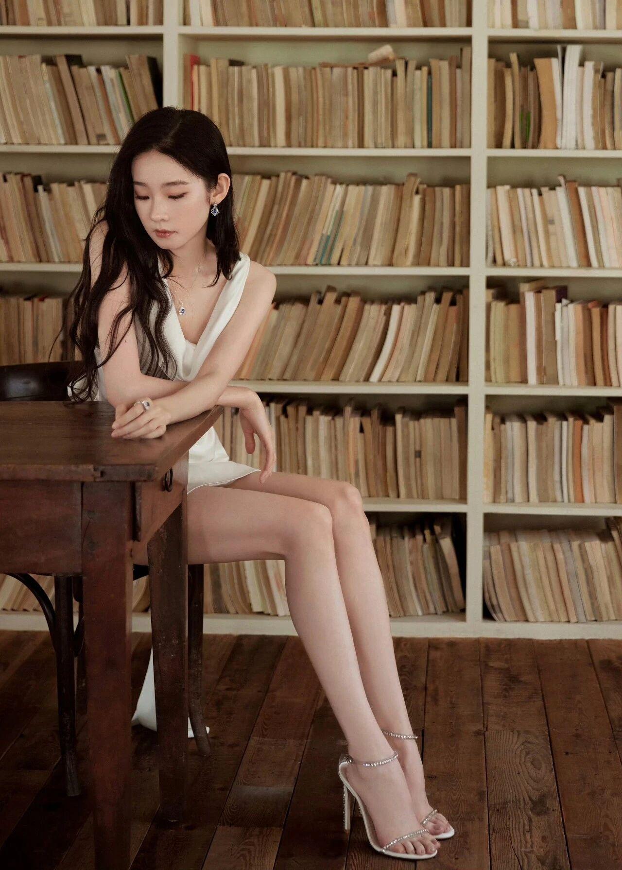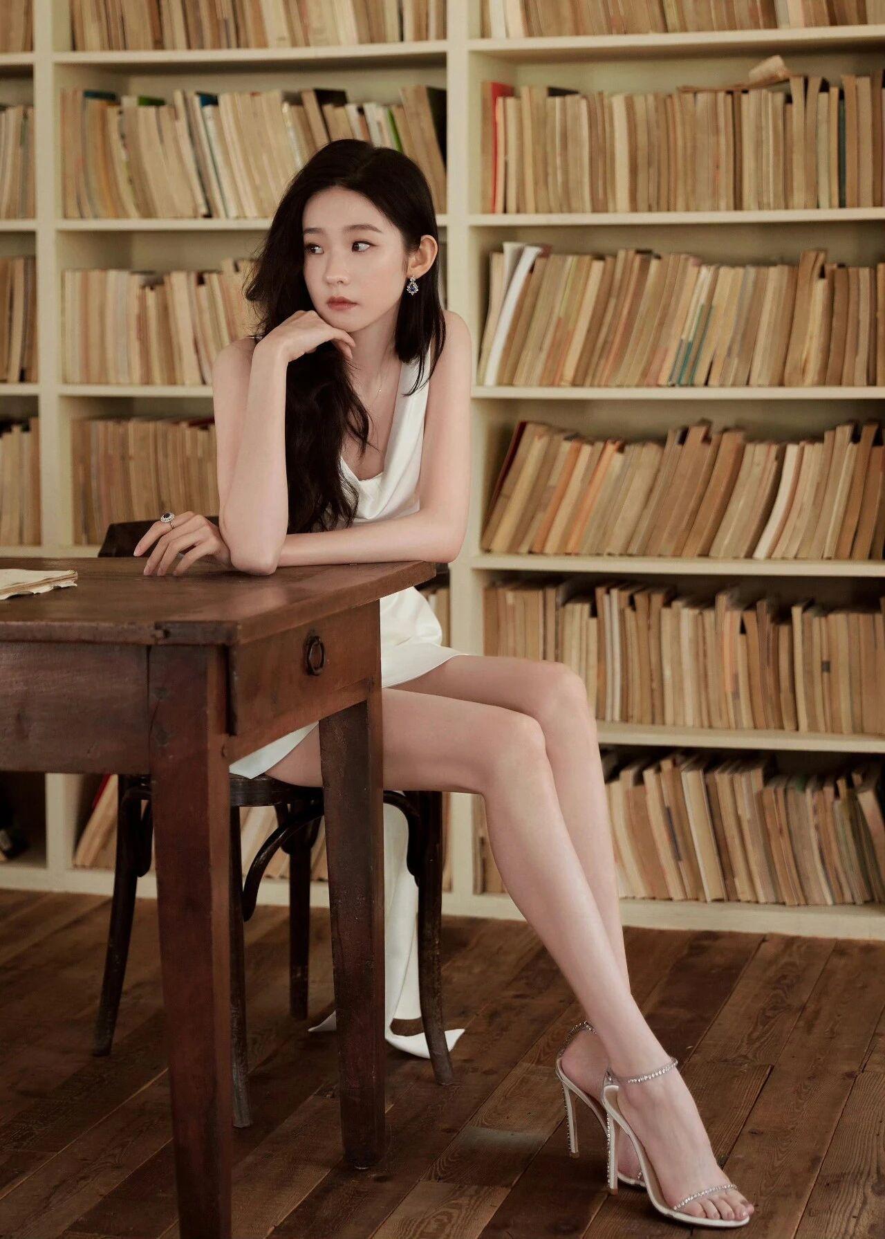 造型:乌黑的长卷发自然垂落,发丝微卷蓬松,自带慵懒氛围感;妆容清透淡雅,眉眼精致,气质清冷又温柔。