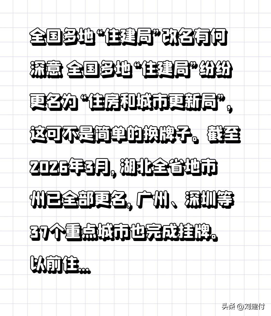 全国多地“住建局”纷纷更名为“住房和城市更新局”,这并非简单换牌。截至2026年3月,湖北全省地市州已全部完成更名,广州、深圳等37个重点城市也完成挂牌。