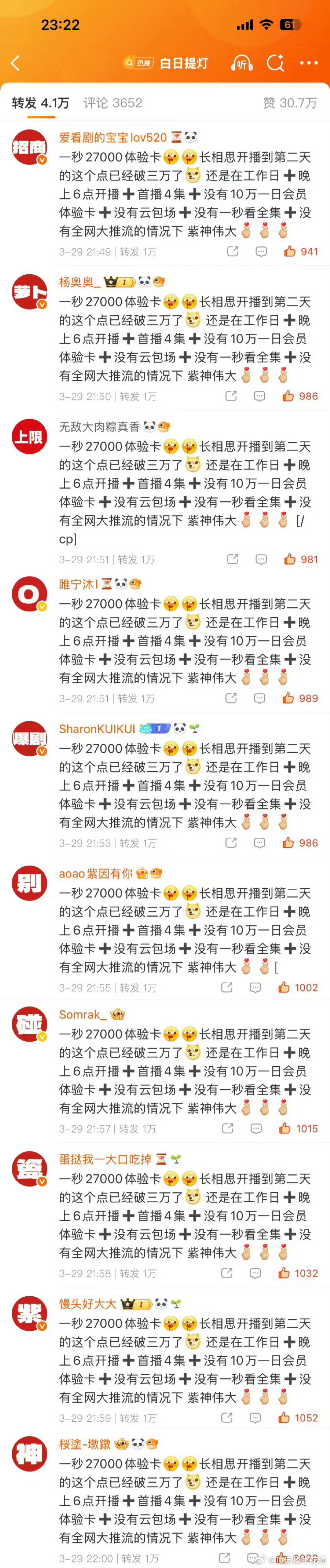 紫粉给排字了,但是我感觉巴姐大粉并不care这个,到目前为止都没看到她打分发了几个讨论剧情的帖子。ps:虽然长相思没有十万云包场没有中午12点开播没有播5集,同题材同导演同平台开播,拿它压提灯还是有点大材小用,太看得起对方之嫌。