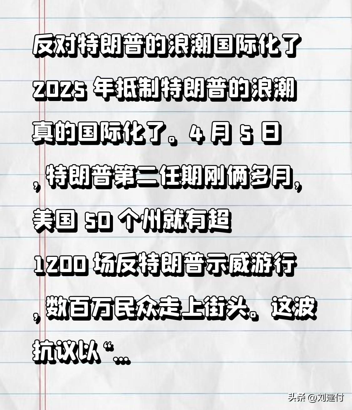 反对特朗普的浪潮国际化了 反对特朗普的浪潮走向国际化。2025 年,抵制特朗普的浪潮真的国际化了。4 月 5 日,特朗普第二任期刚过俩多月,美国 50 个州就爆发超 1200 场反特朗普示威游行,数百万民众走上街头。这波抗议以“Hands Off”为口号,直指他 4 月 2 日宣布、5 日生效的“对等关税”政策。民众还对他的经济、社会和政府改革进行了全面批判。