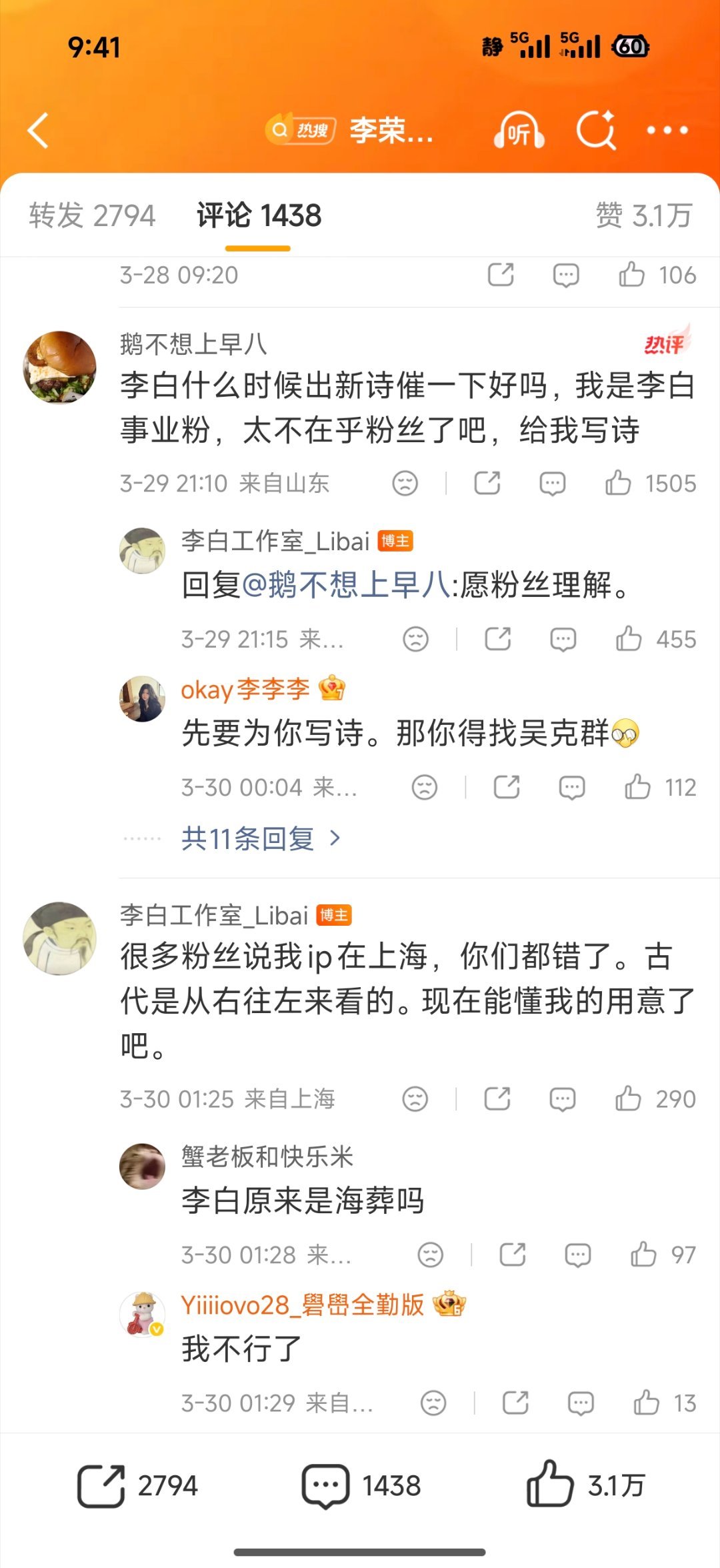 李白工作室李白不愧是大文豪来的,回复的好幽默。知道海上ip是什么意思吗,传说中他因捞月而死,掉入水中被冲到海里了