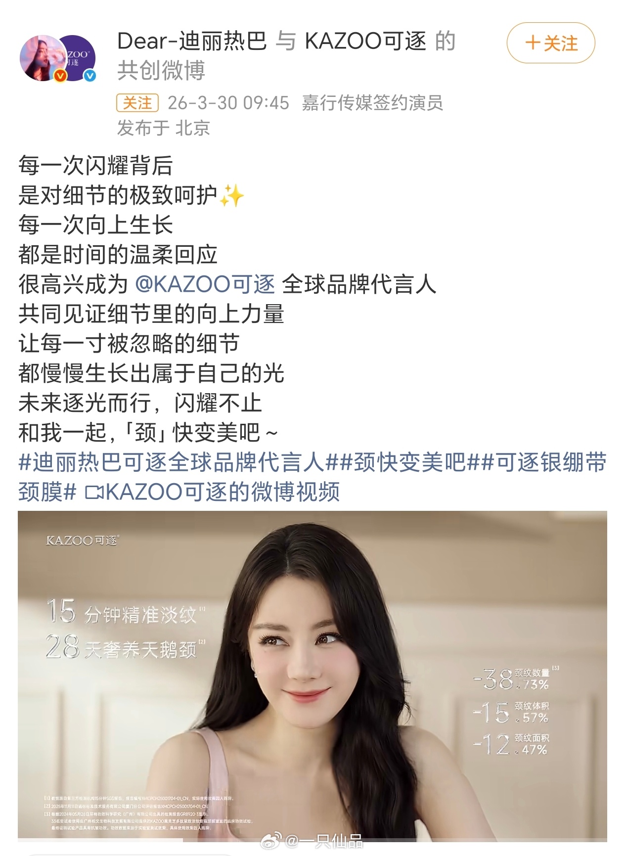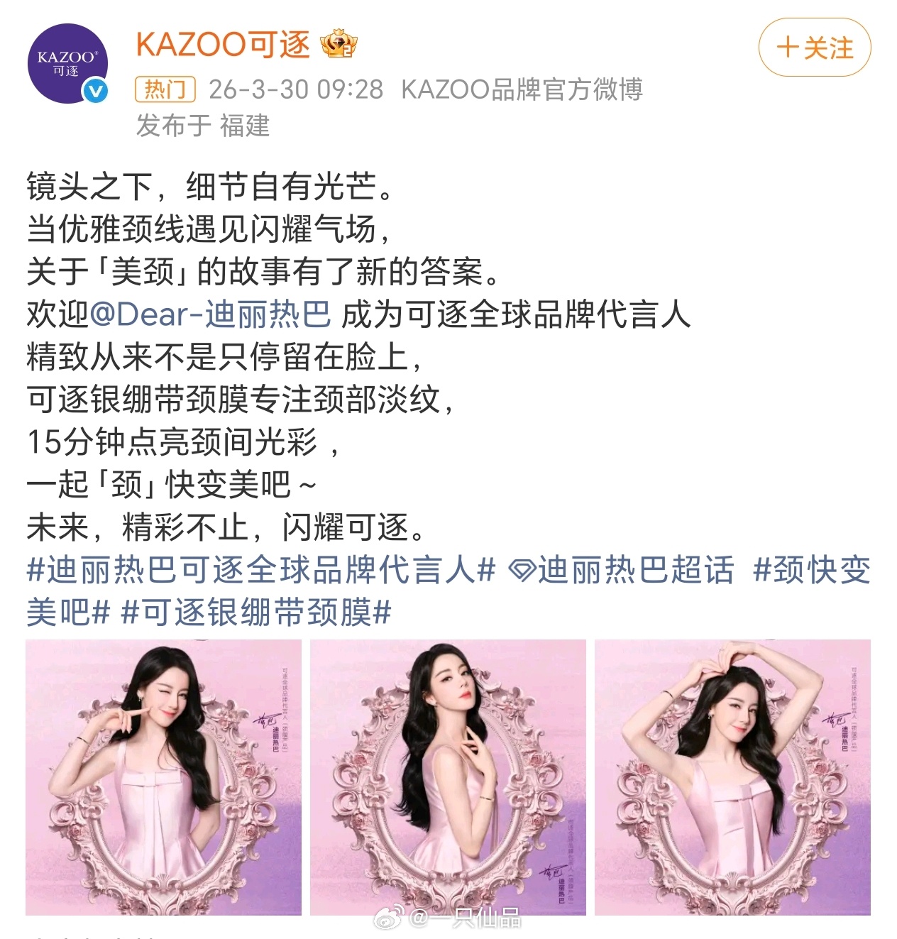迪丽热巴可逐全球品牌代言人官宣,全球代➕1