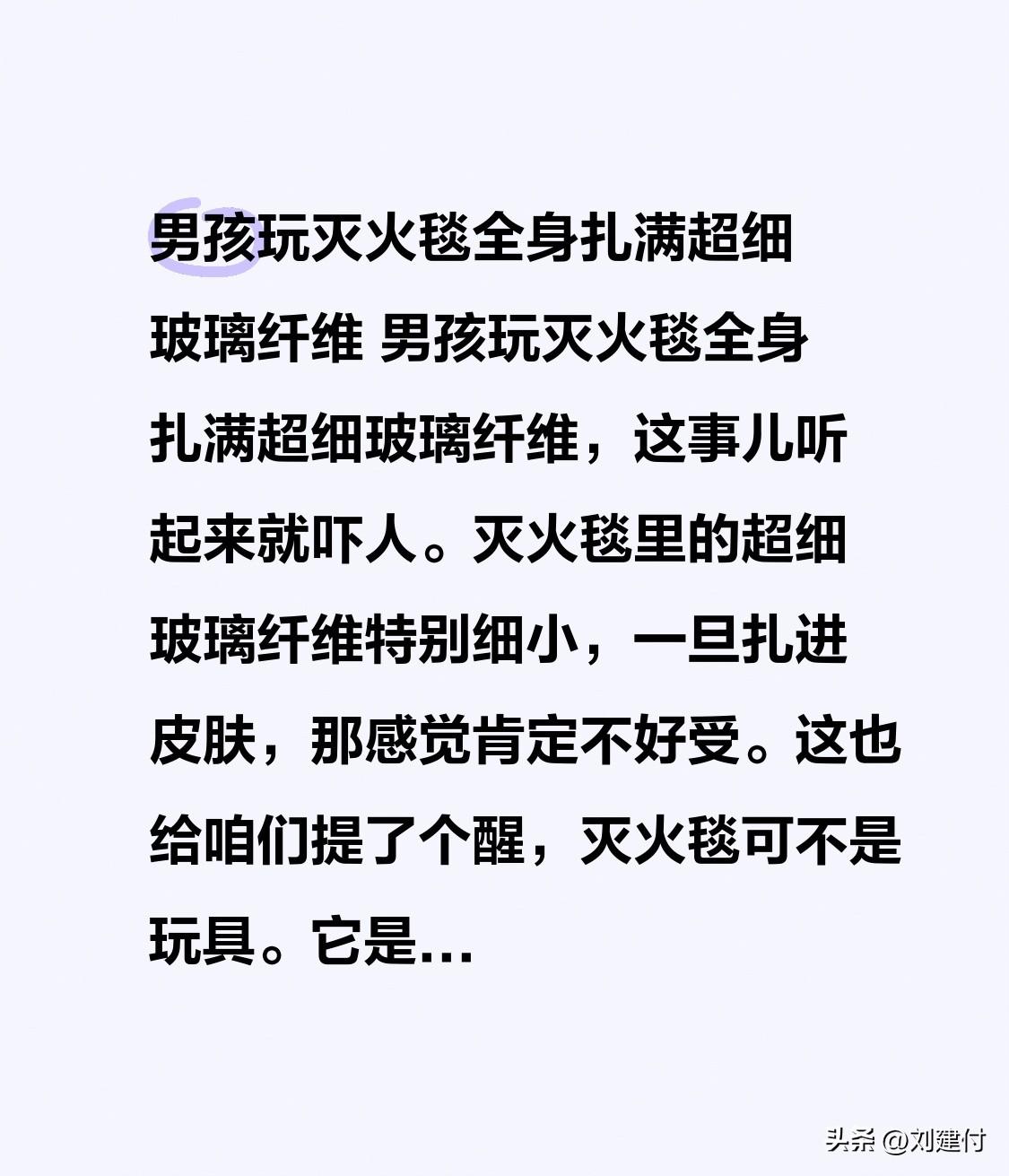 男孩玩灭火毯全身扎满超细玻璃纤维 男孩玩灭火毯,全身扎满超细玻璃纤维,光听着就令人胆战心惊。灭火毯中的超细玻璃纤维极为细小,一旦扎进皮肤,滋味肯定不好受。